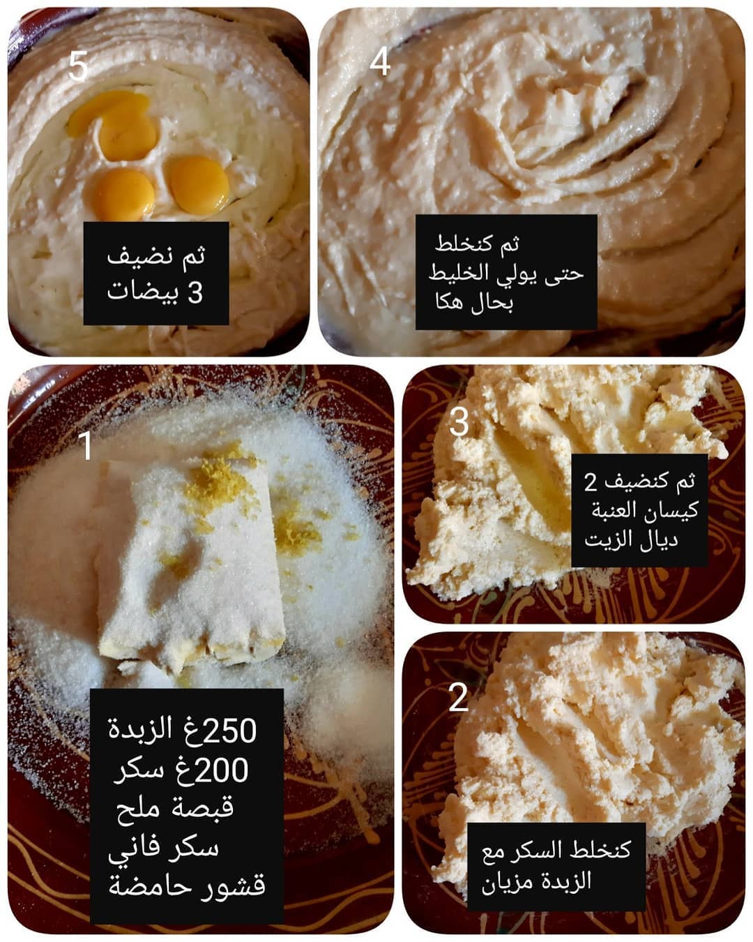 نخلط الزبدة مع السكر جيدا مع رشة ملح و الفاني و قشور الحامض ثم نضيف الزيت ونخلط جيدا ثم البيض و في الأخير الدقيق و الخميرة نترك العجين مرخوفا نوعا ما بعد أن تنسجم كل المكونات نقسم العجين على أربع