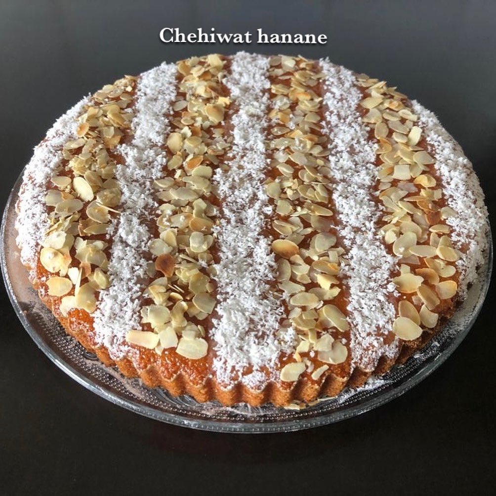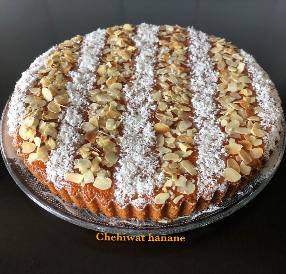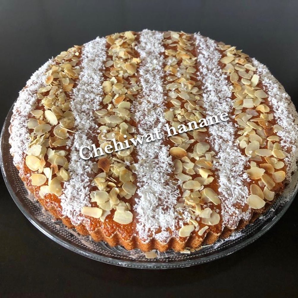 نترك البسبوسة تبرد جيدا. تذهن بمربى المشمش و تزين بالكوك و اللوز ايفيلي