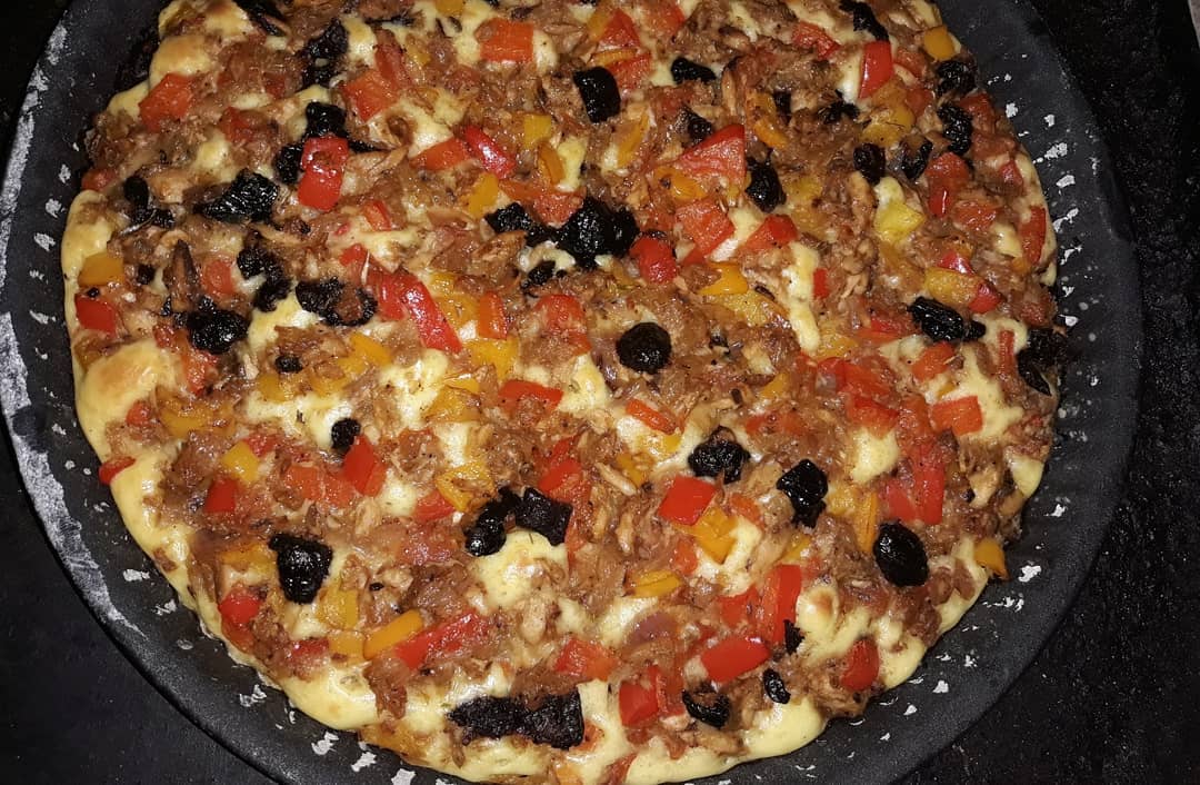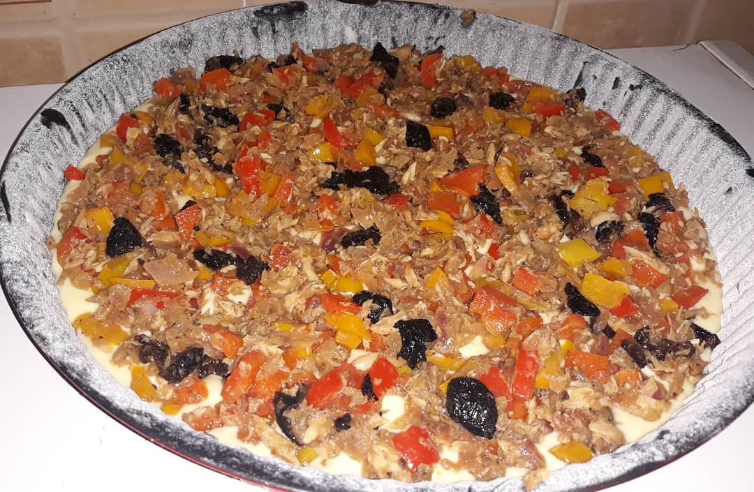 انا شحرت البصلة مع قليل من الزيت المائدة فيها الملح او الفلفل الاسود حتى هبطات زت معها نص حبة فلفل احمر او نص حبة فلفل اصفر او طماطم واحدة مقطعين مربع حتى تشحرو مزيان طفيت عليهم او ضفت 2 علب ديال الطون مصفي من الزيت او درت الزيتون الاسود او خليتو على جنب حتى يبرد بيما نوجد خليط البيتزا السائلة