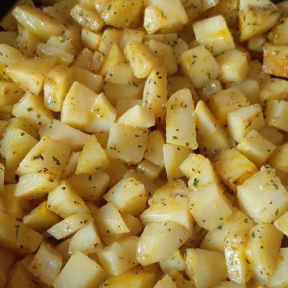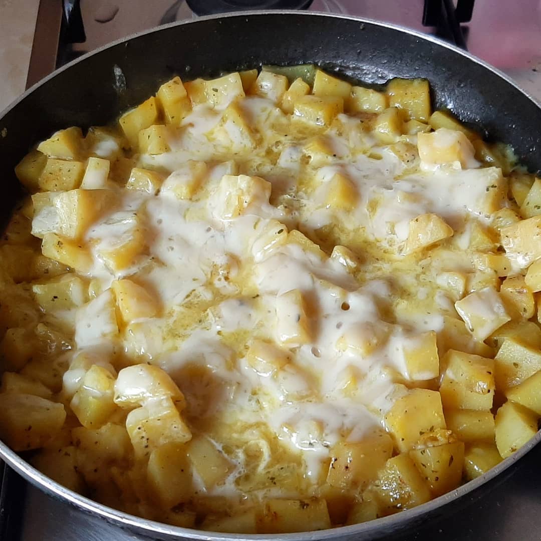 ✔في مقلاة نضع الزيت و البطاطس و نضيف الثوم نشحروها و نضيف التوابيل و نتركها على نار مهيلة و نغطوها و كل مرة نحركها من نحس بيها طايبة نضيف البيض و الجبن و الاعشاب المنسمة و تقدم بالصحة و الراحة