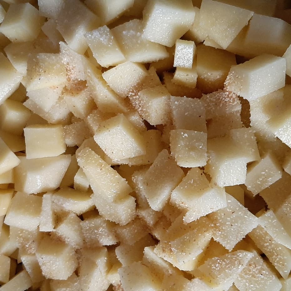 .حبات بطاطس مقطعة قطع صغيرة _بودرة الثوم_فلفلة حلوة اذا متوفرة _معدنوس يابس_اعشاب منسمة_جبن محكوك_بيضة_ملح_فلفل اسود_سكنجبير_خرقوم