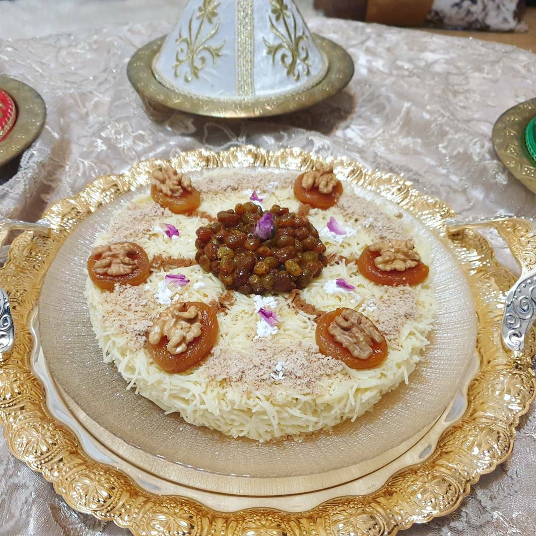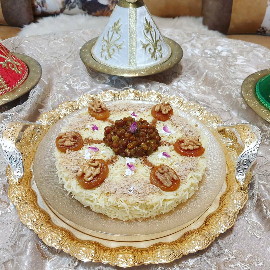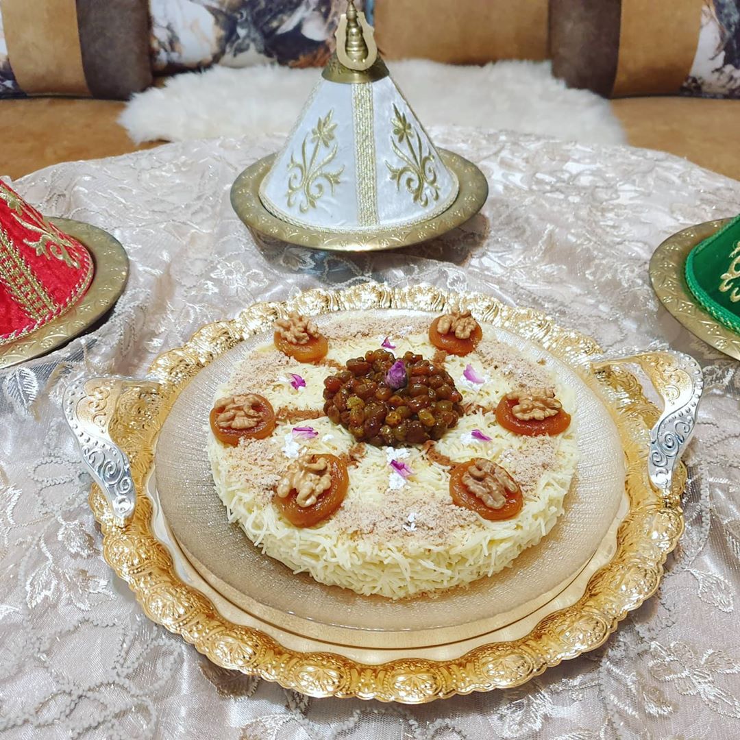 حطيت فوق منها المشماش لي معسل ودايرة فوقو كركاع وفالوسط درت الزبيب وزينت بالسكر الصقيل واللوز لي محمر بقشورو ومطحون والقرفة وشوية من الورد البلدي كإضافة