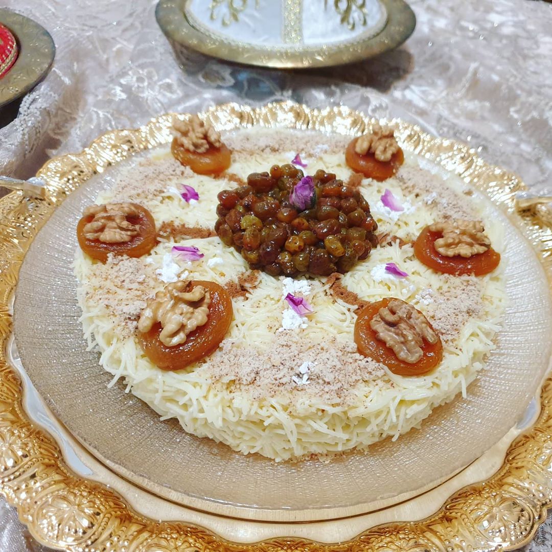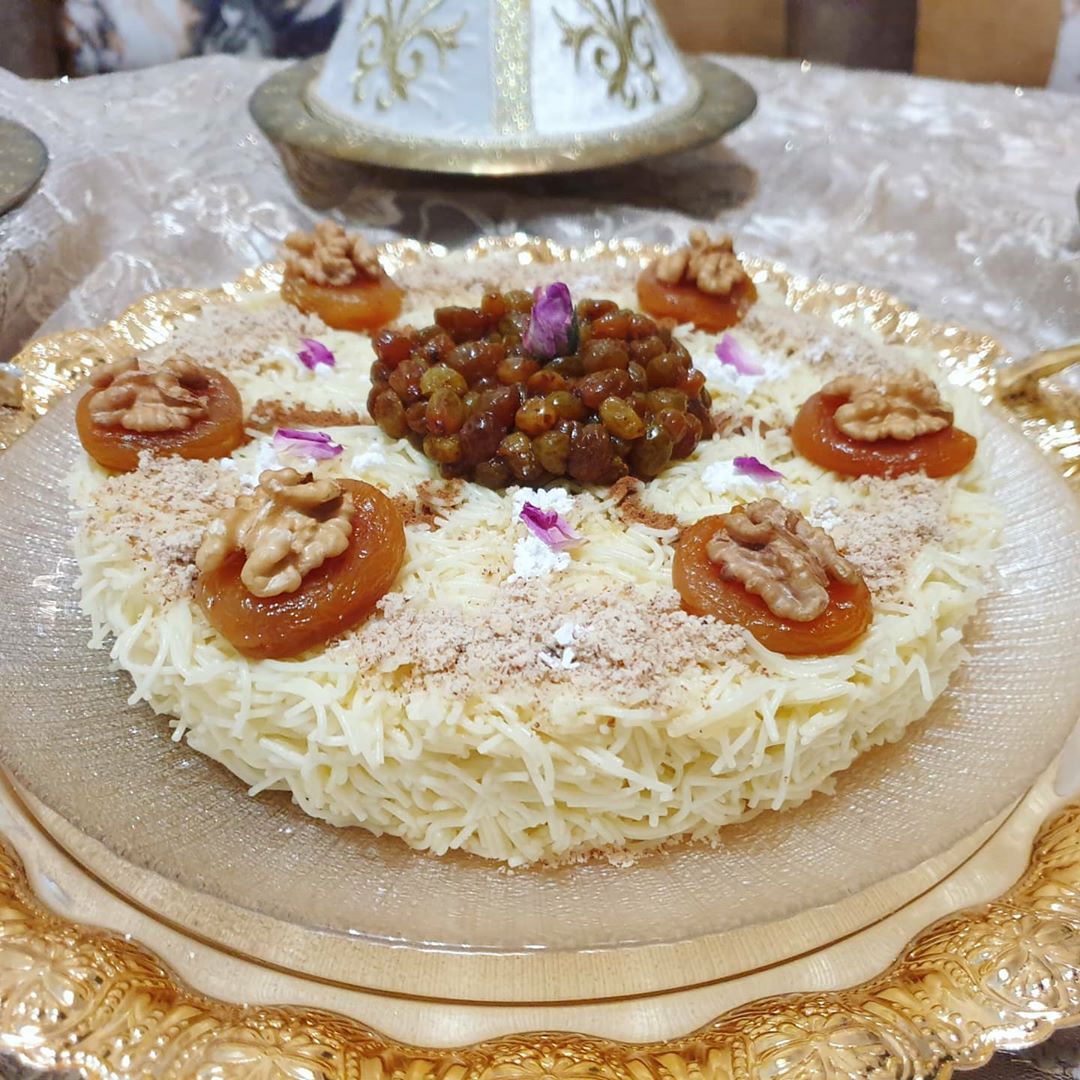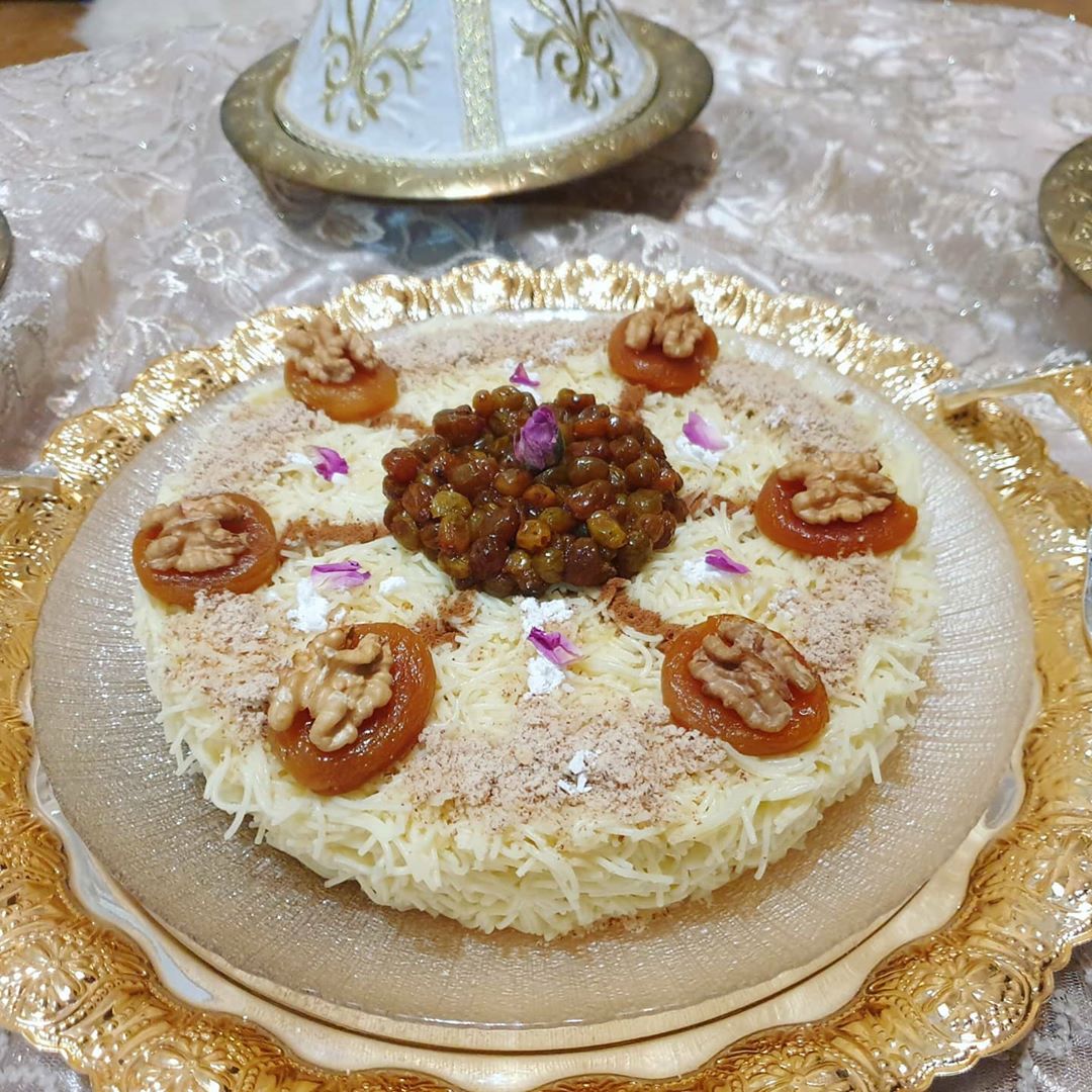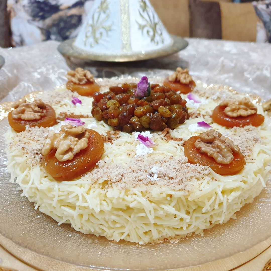 حطيت فوق منها المشماش لي معسل ودايرة فوقو كركاع وفالوسط درت الزبيب وزينت بالسكر الصقيل واللوز لي محمر بقشورو ومطحون والقرفة وشوية من الورد البلدي كإضافة