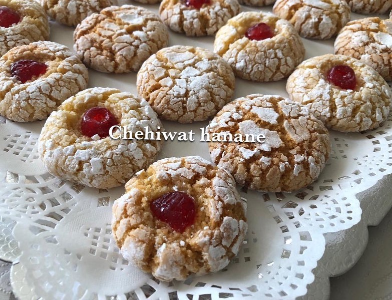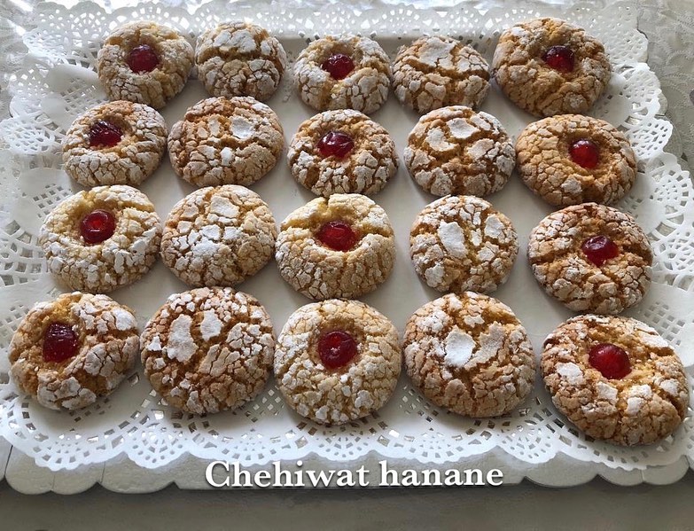 نذهن اليد بالماء و نشكل كرات تمرر 2 مرات في سكر كلاصي، و نضغط عليها قليلا بالإبهام. تدخل لفرن مسخن مسبقا بحيث تكون النار فوقها و تترك تتشقق، ثم نشعل النار لتتحمر من تحت.