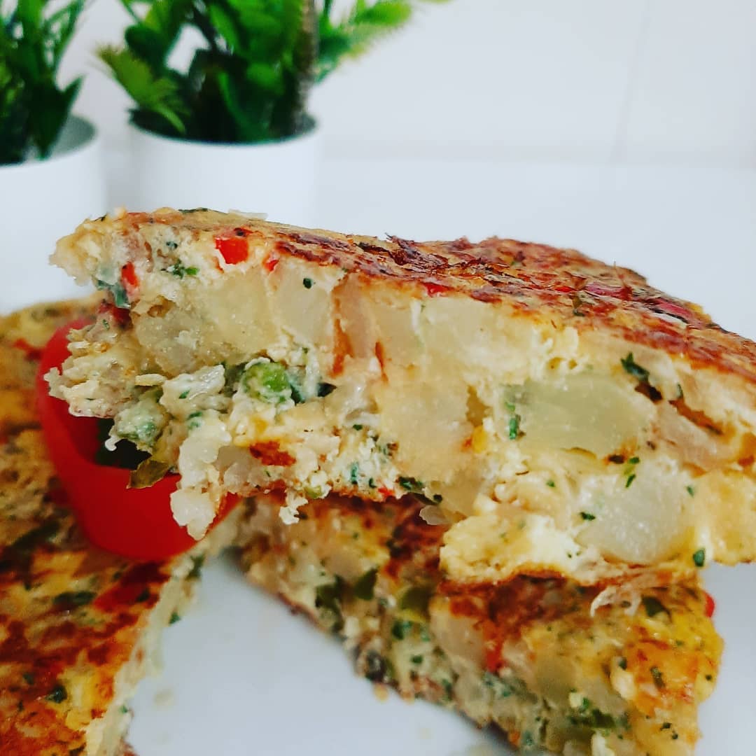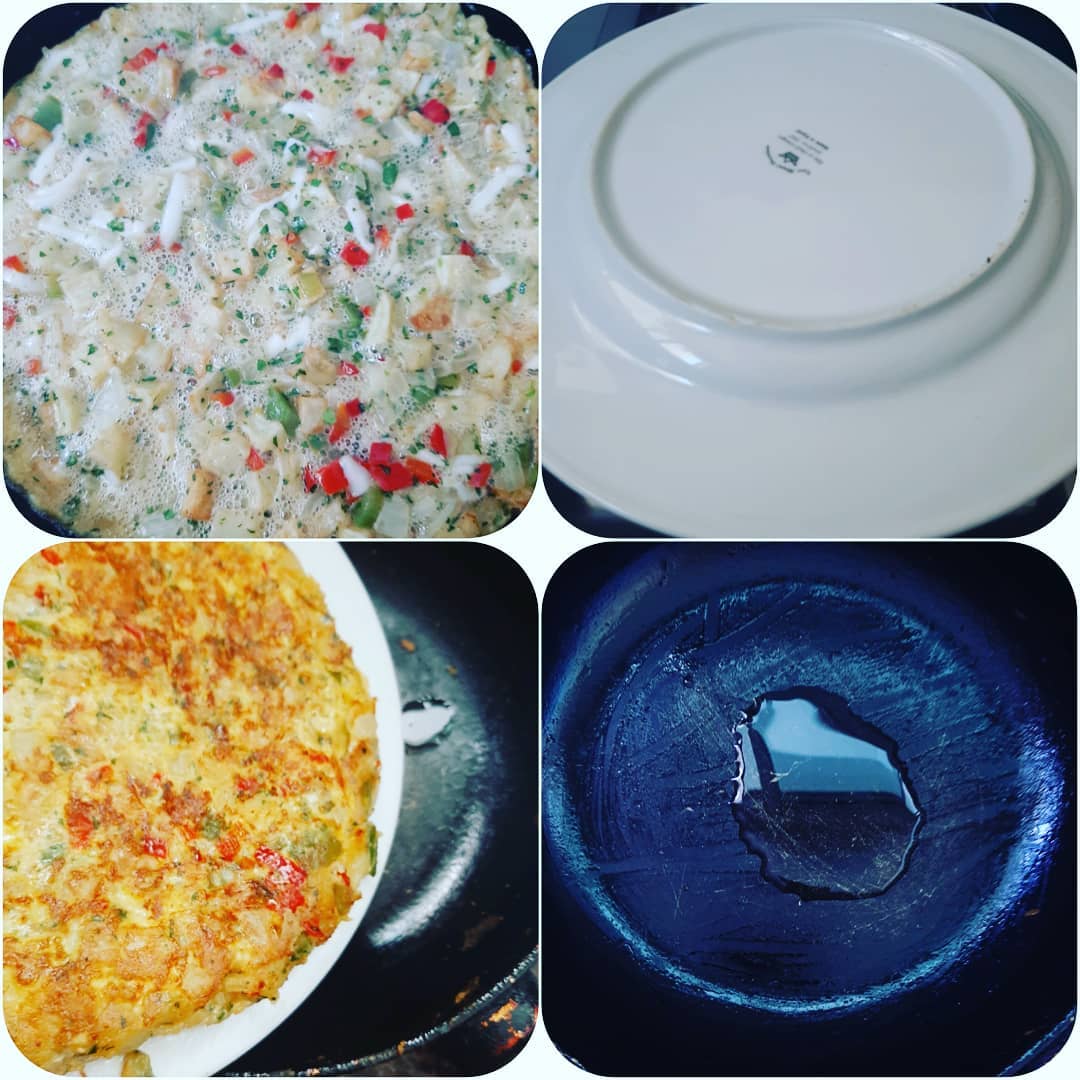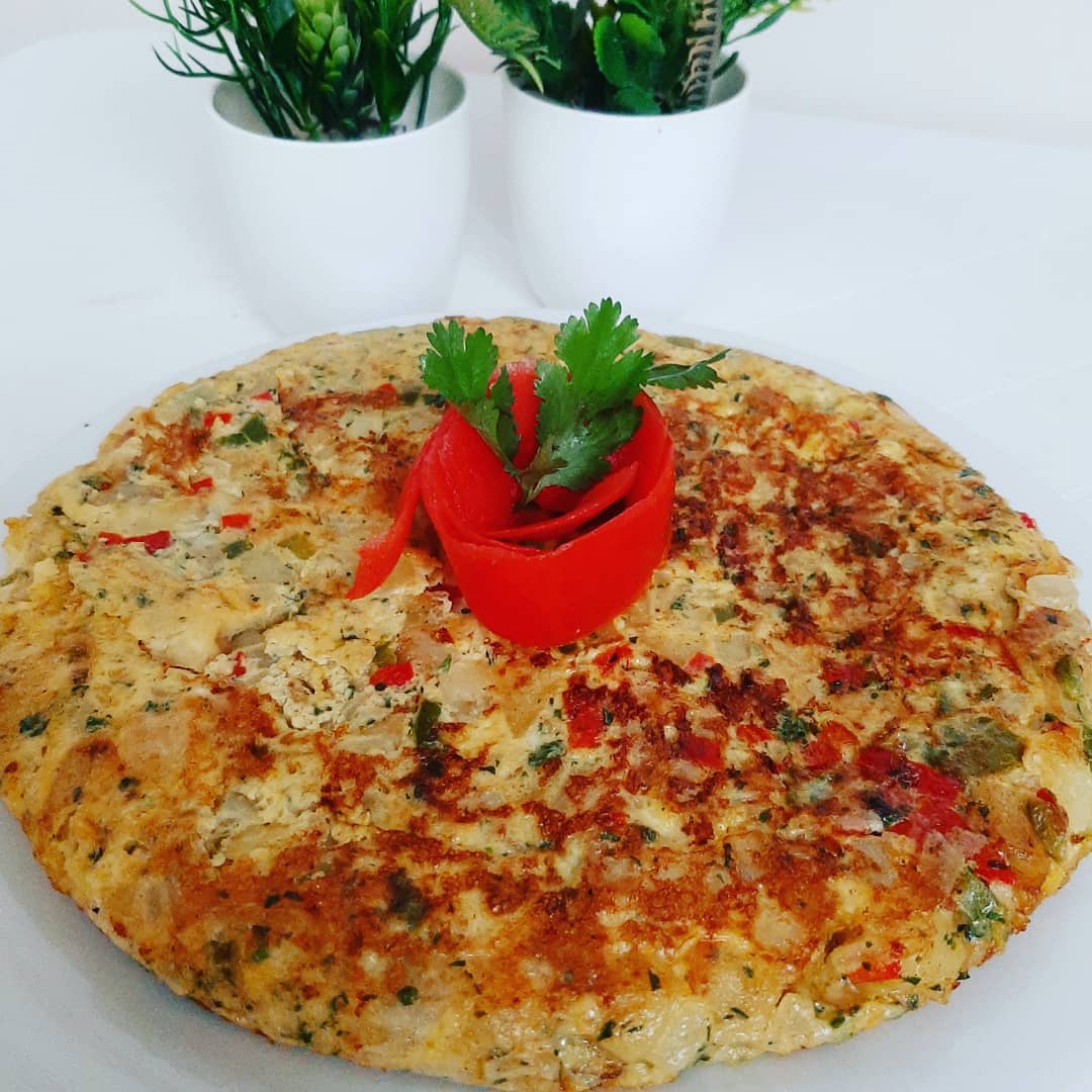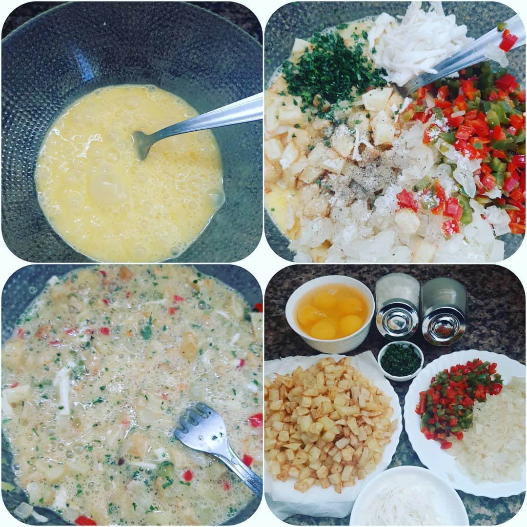 فمول كبير نطرب البيض ونضيف جميع المكونات ونخلط مزيان وناخد مقلاة تكون غير لاصقة ضروري تكون مكتلصقش وندهنوها بالزيت أو الزبدة لي بغيتو ونوضع الخليط في المقلاة فوق نار مهيلة ونغطيوها ملي نشوفها شدات فراسها ودخلها الطياب نقلبوها على الوجه الاخر ونخليوها تكمل طيابها