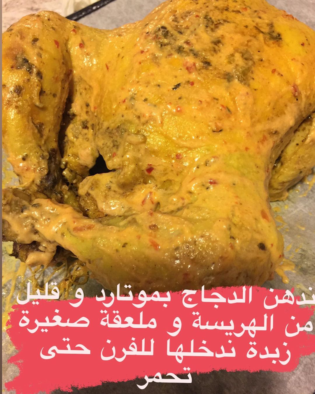 ملي طيب الدجاجة ندهنها بخليط من : الموطارد الزبدة و الهريسة و نرجعوها تتحمر
