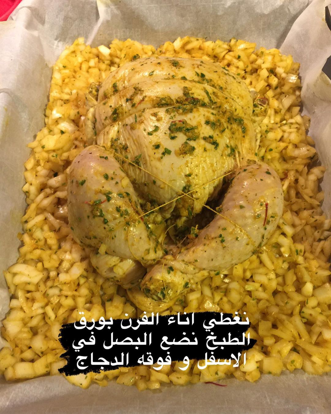 في إناء فرن نفرشو ليه ورق الطبخ نديرو البصلة لتحت و فوقها الدجاجة و نغطي مزياان بورق الطبخ ثم ورق الألومنيوم و ندخلها للفرن لمدة ساعة و نصف او حسب كل وحدة و فرانها على 180 درجة