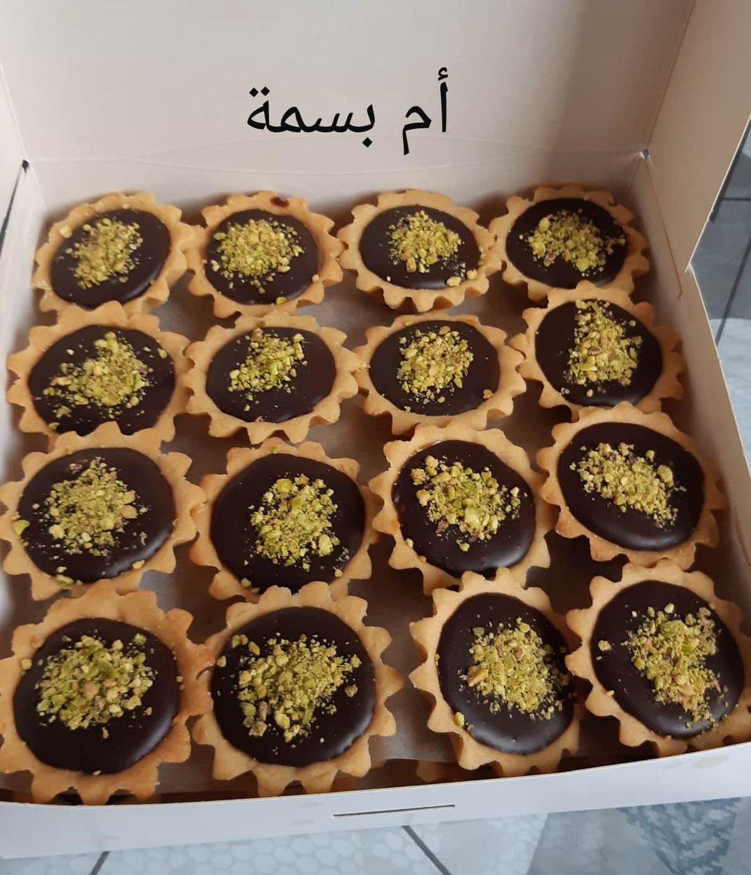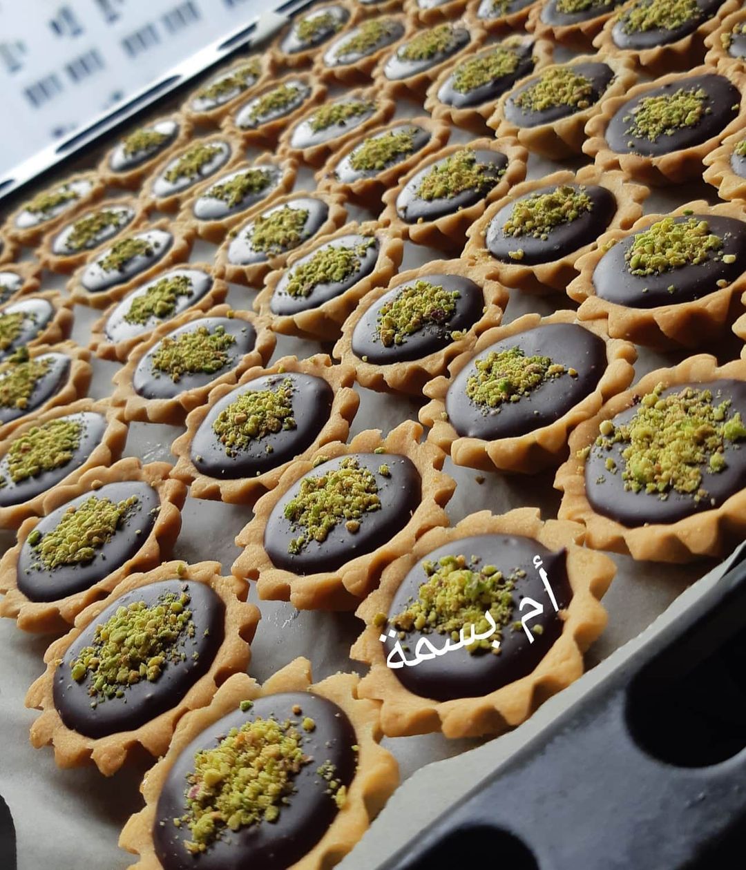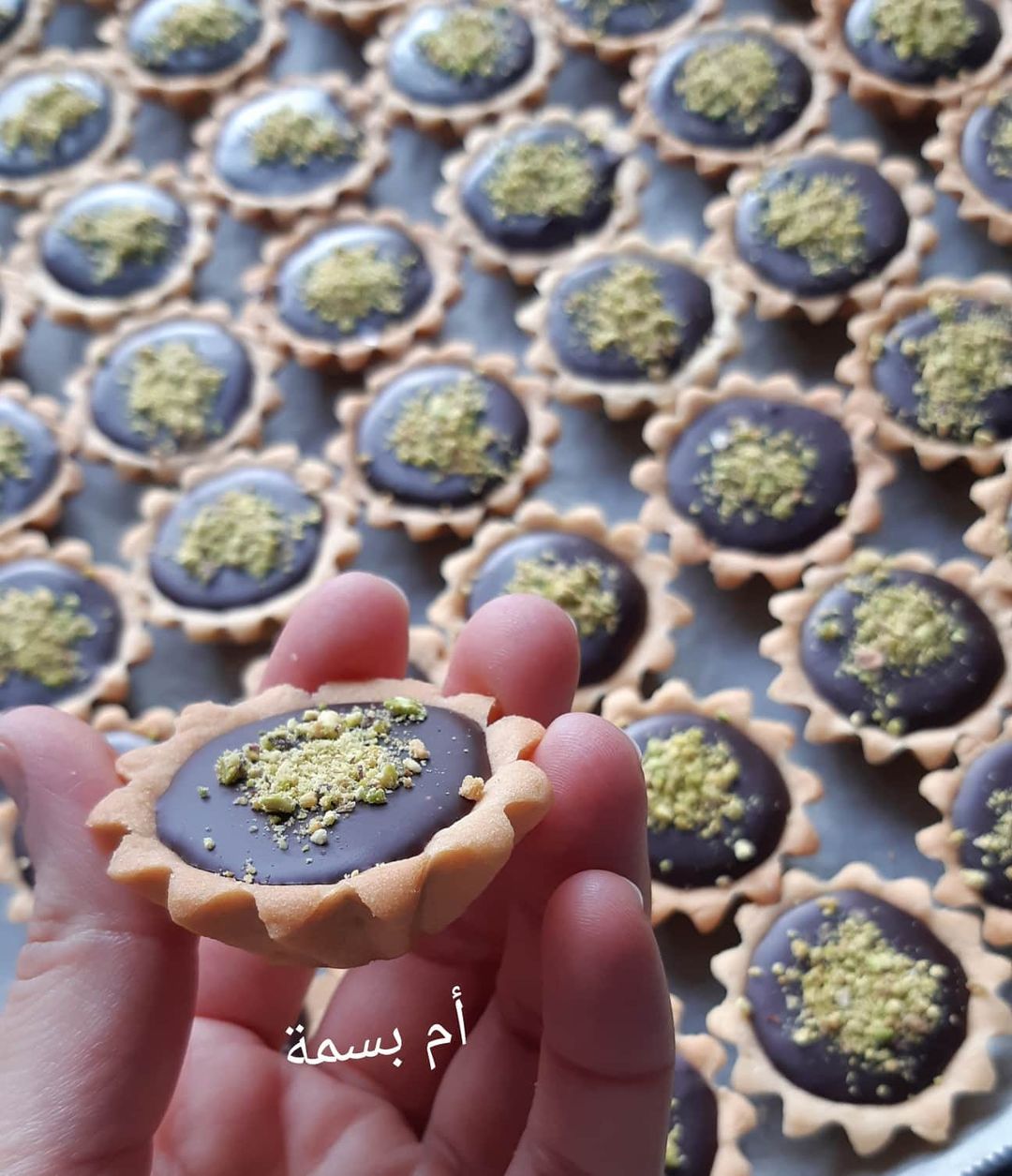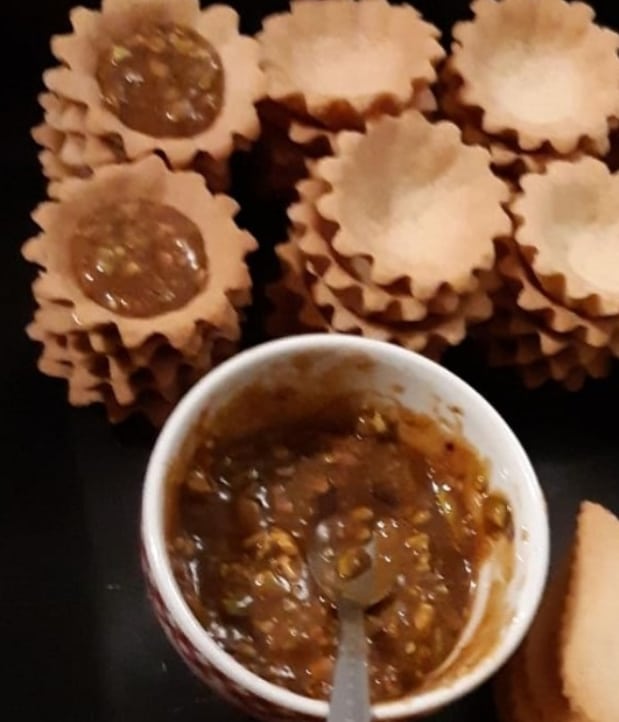 نقوم بخلط كمية من الفستق مع الكراميل ونملأ نصف التارتولات