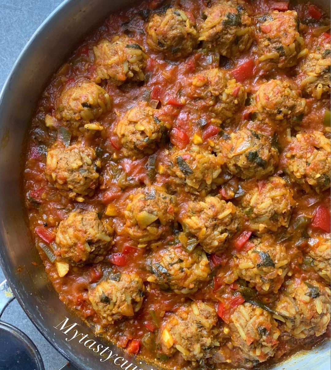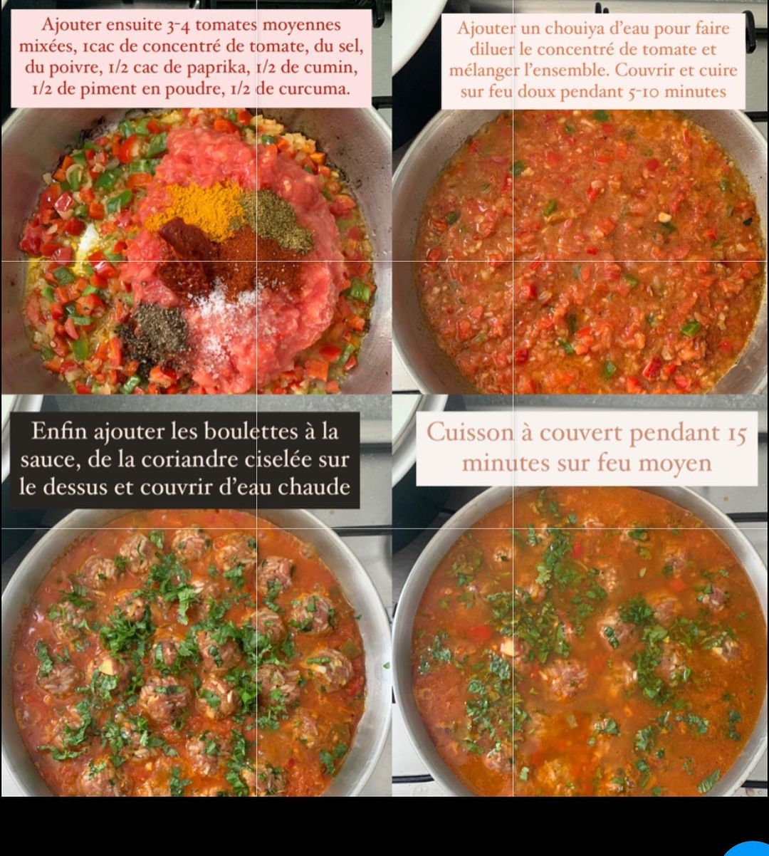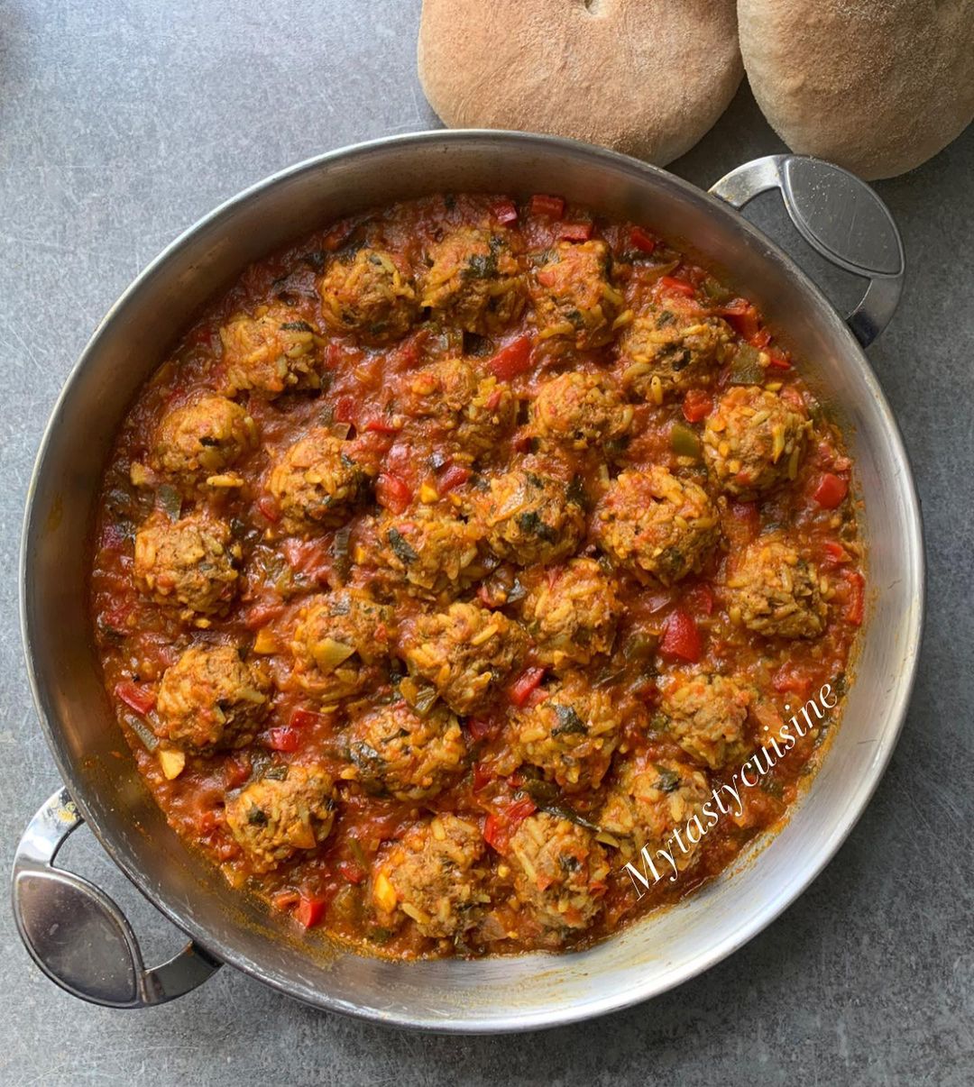 في مقلاة او طنجرة على النار نضع القليل من الزيت بصل و فلفل الوان و ثوم نقلي المكونات قليلا ثم نضيف صلصة الطماطم و التوابل ملح فلفل اسود كركم بابريكا معدنوس ثم نضيف كويرات الكفتة و نترك الكل على نار متوسطة حتى تنضج الكفتة