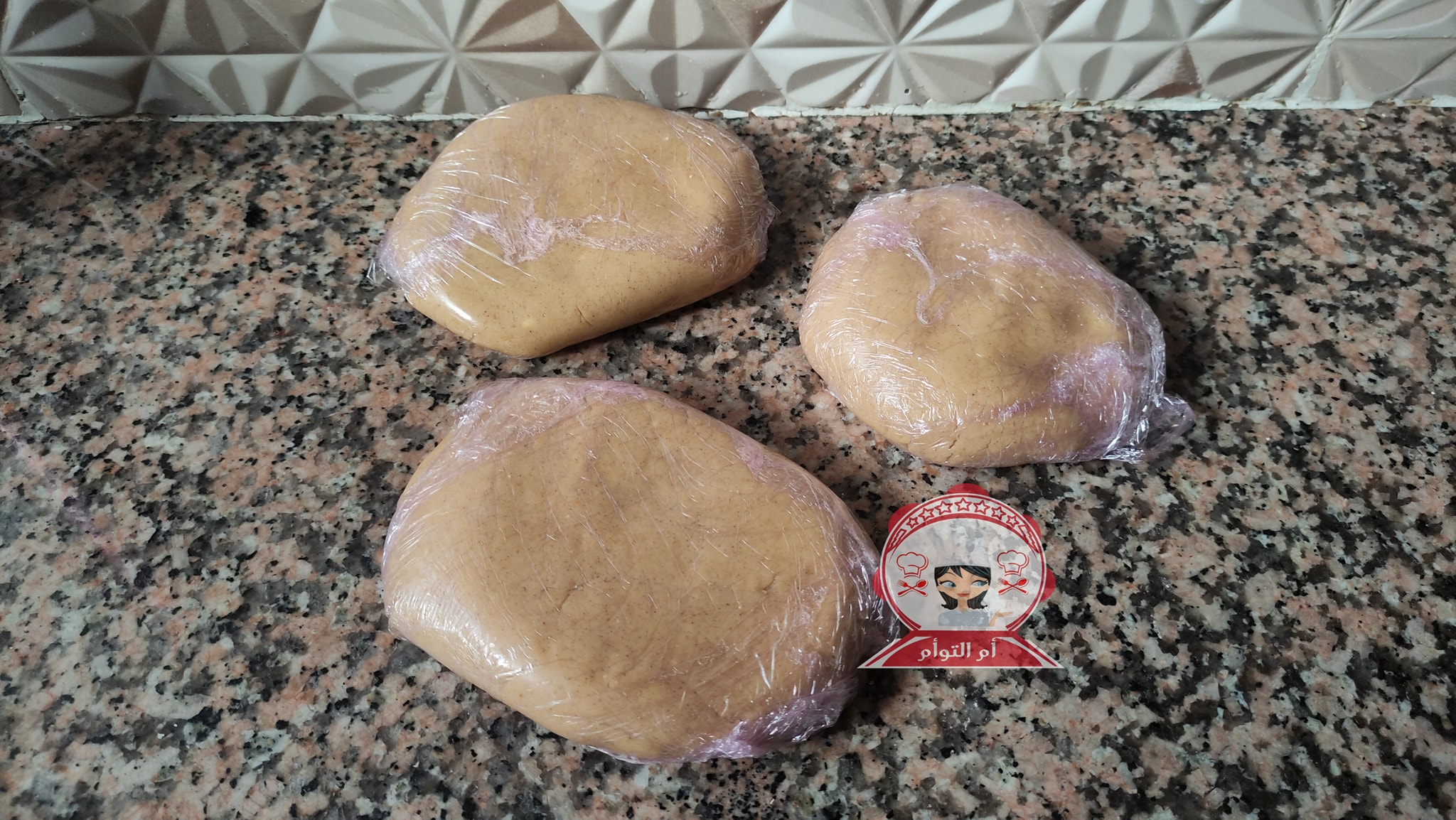 نقسم عجين الصابلي الى ثلاث اجزاء و نضعها في الثلاجة لمدة نصف ساعة