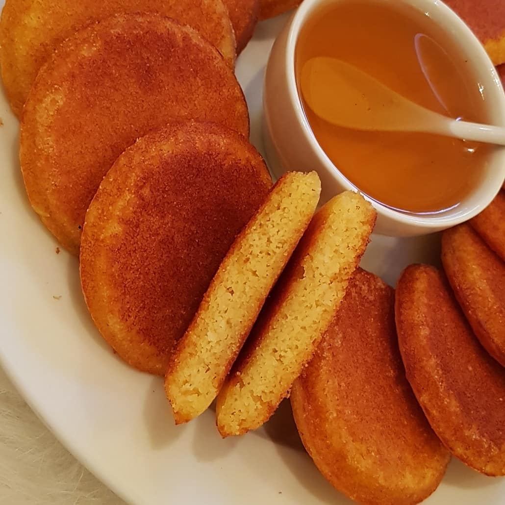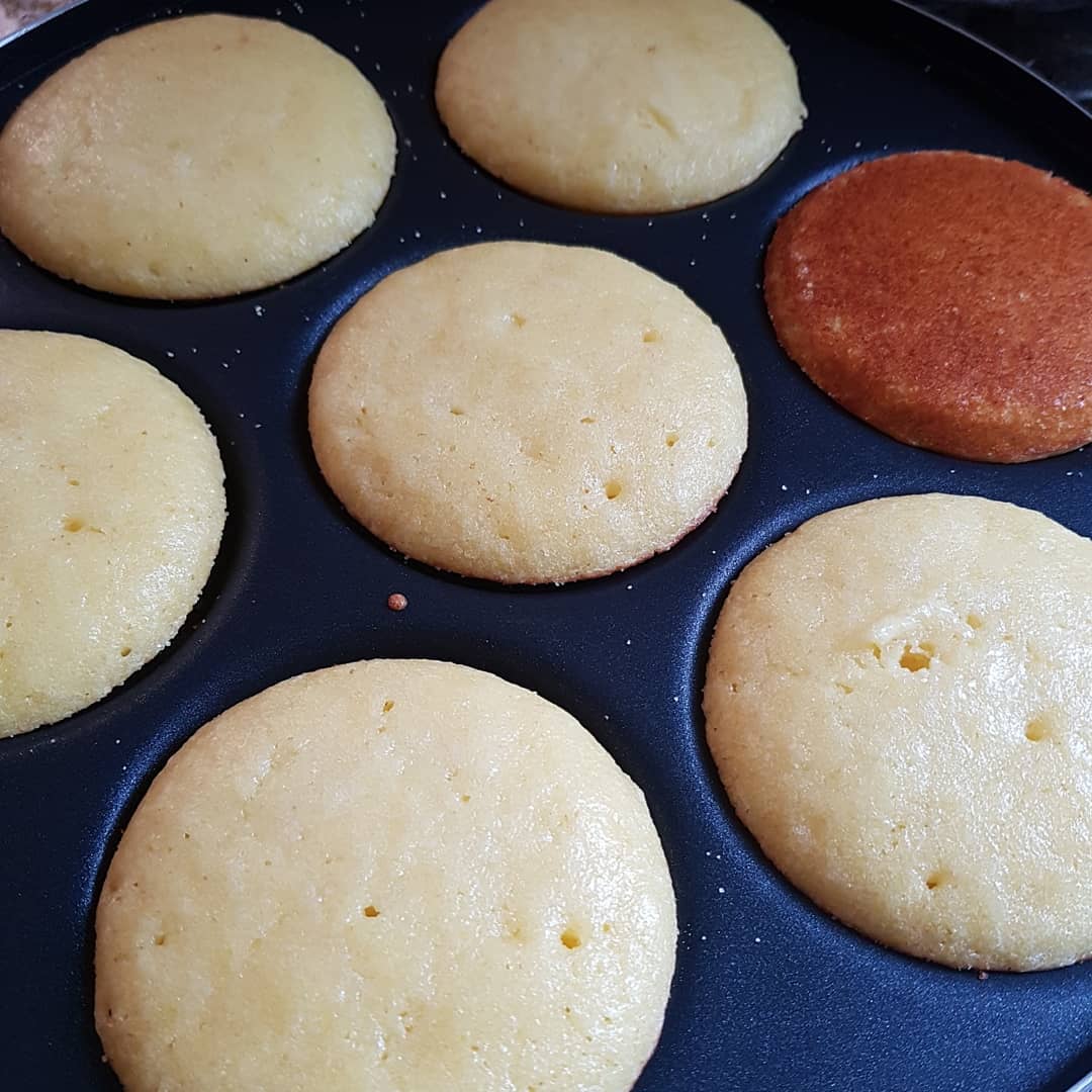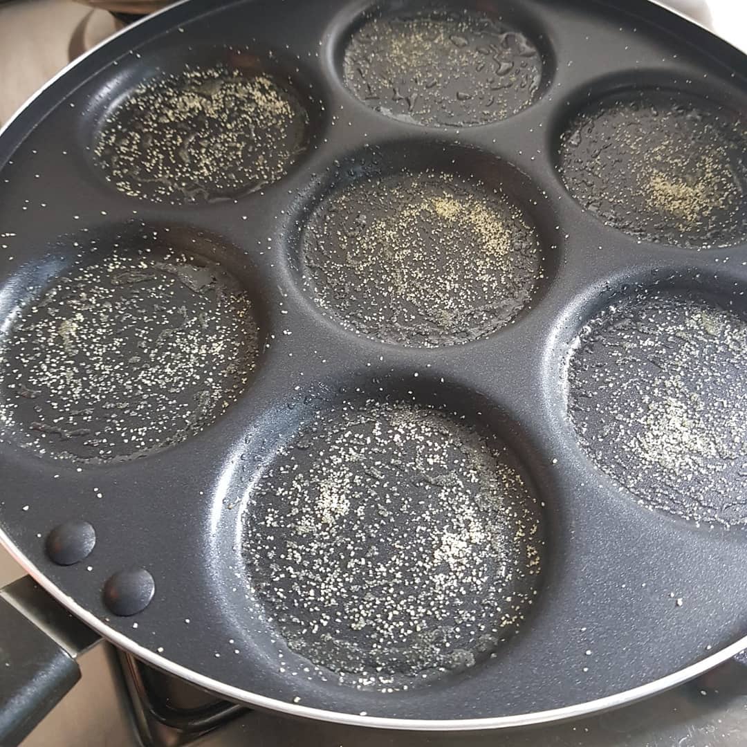 ندهن مقلاة بالزيت ونرش بالسميدة نسكب الخليط ويطهى على نار مهيلة من الجهتين