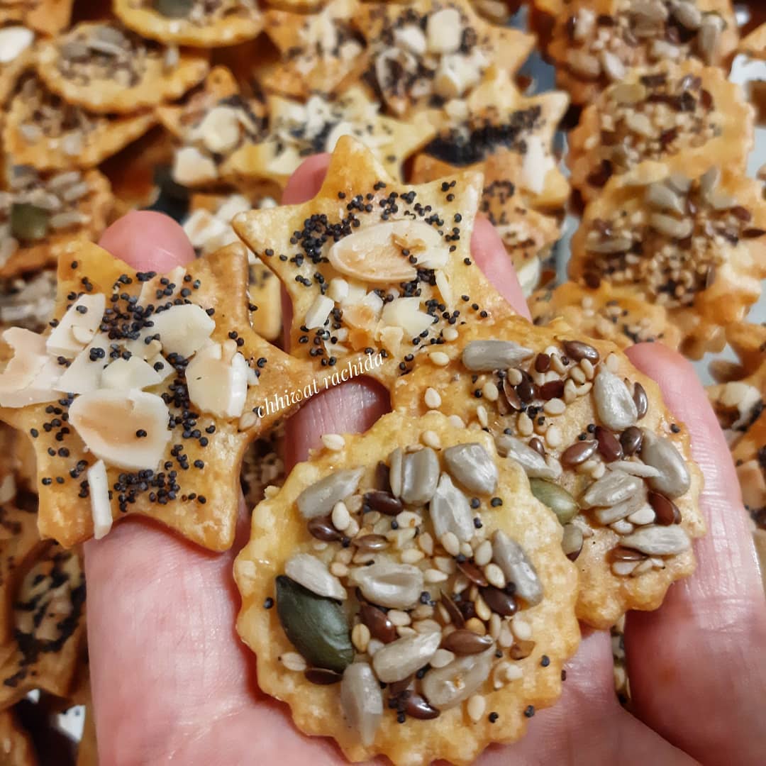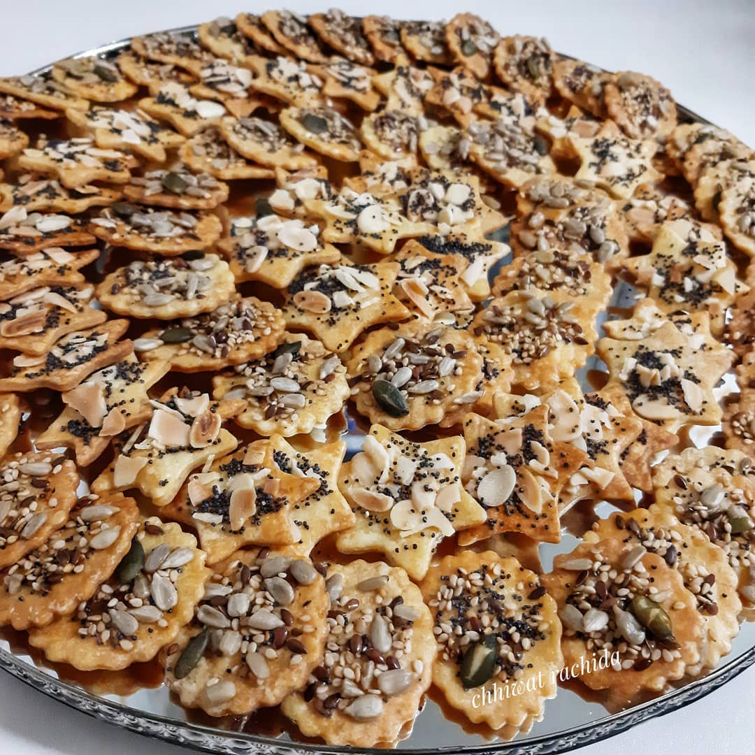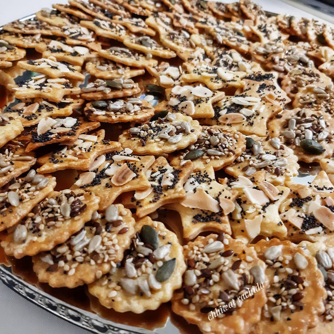 نخلط المكونات جيدا مع بعض و نجمع عجين صابلي بالدقيق نبسطه يجب أن يكون سمكه رقيق جدا نقطعه بالطابع و ندهنه بأبيض البيض و نضع الزرارع ندخل الصابلي للفرن و على نار متوسطة