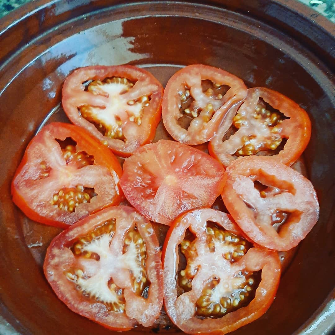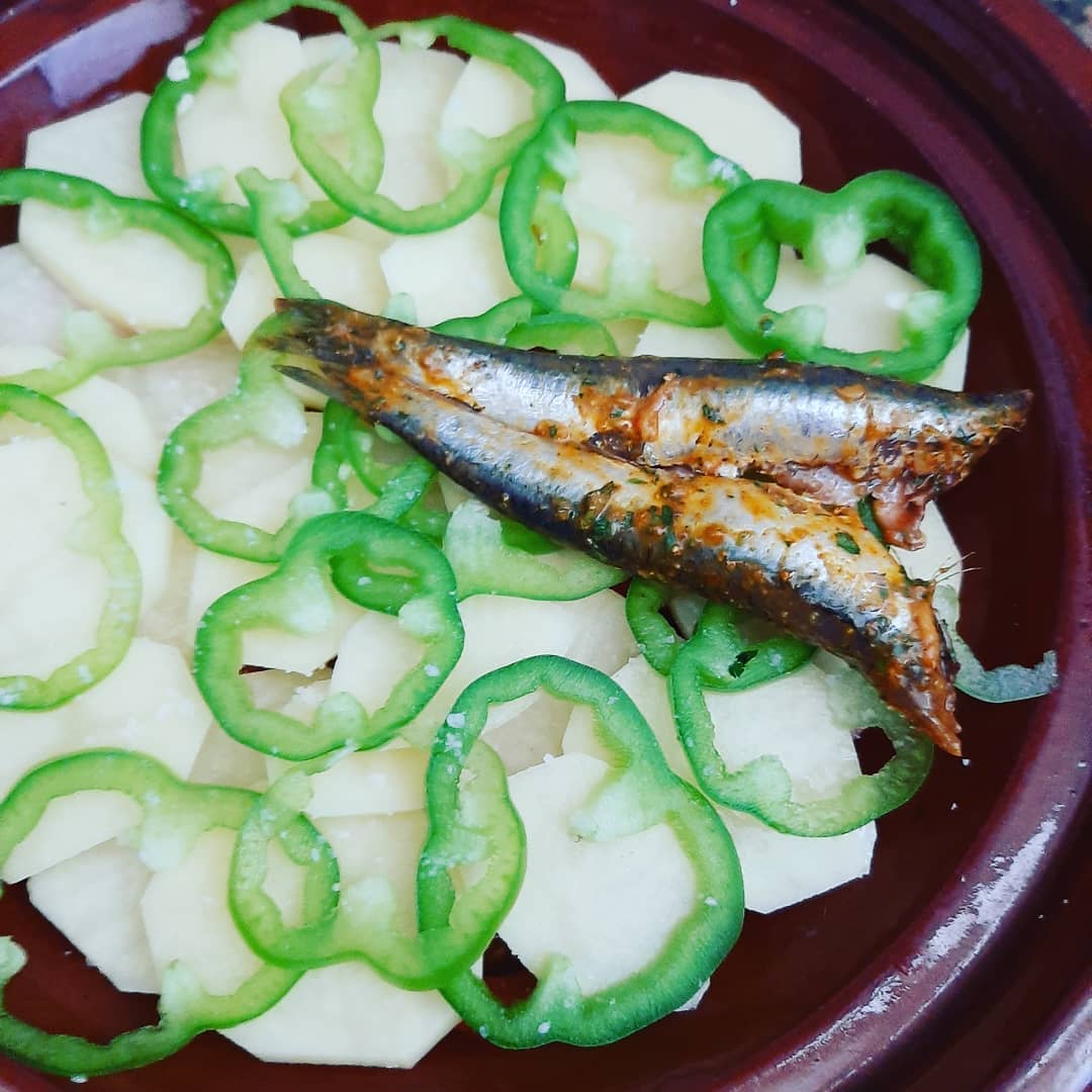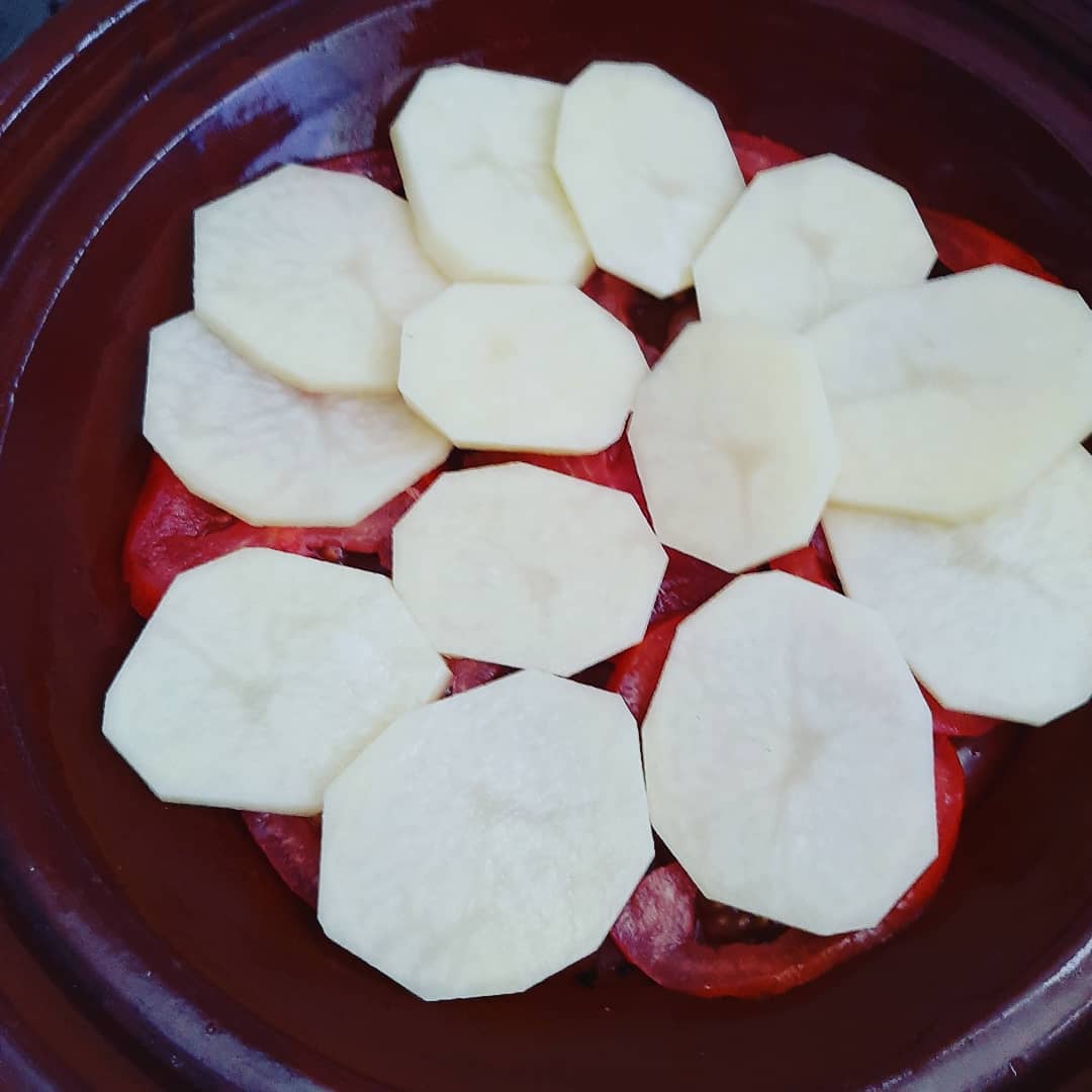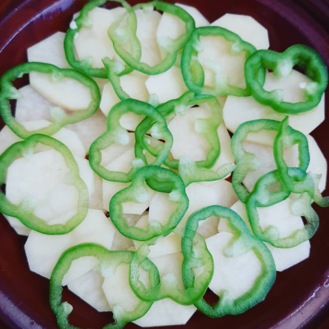 ناخد طجين نفرش فيه طبقة ديال مطيشة دوائر نزيد فوقها بطاطا دوائر والفلفلة