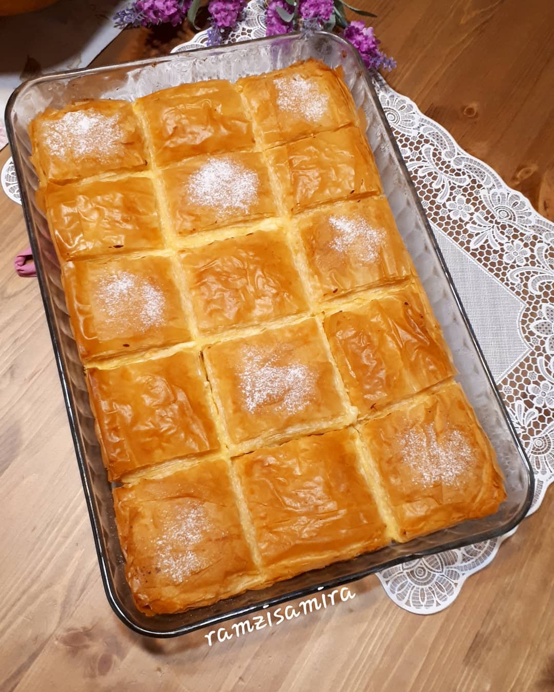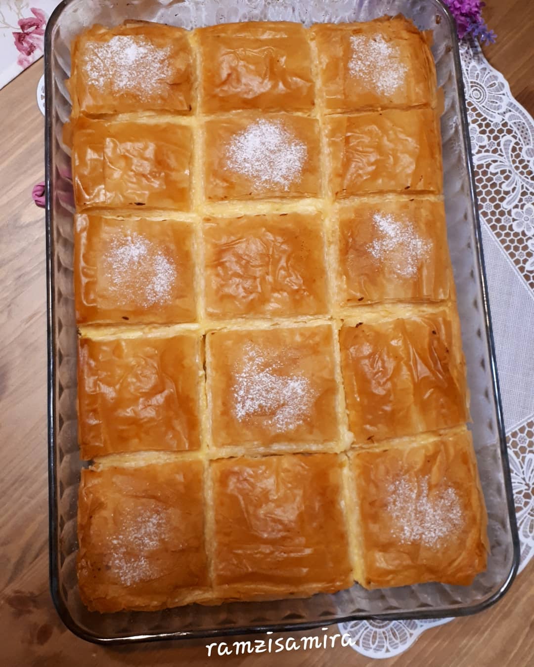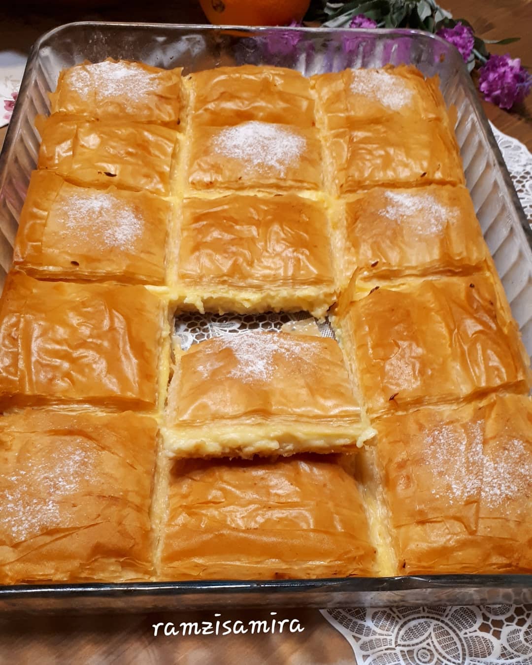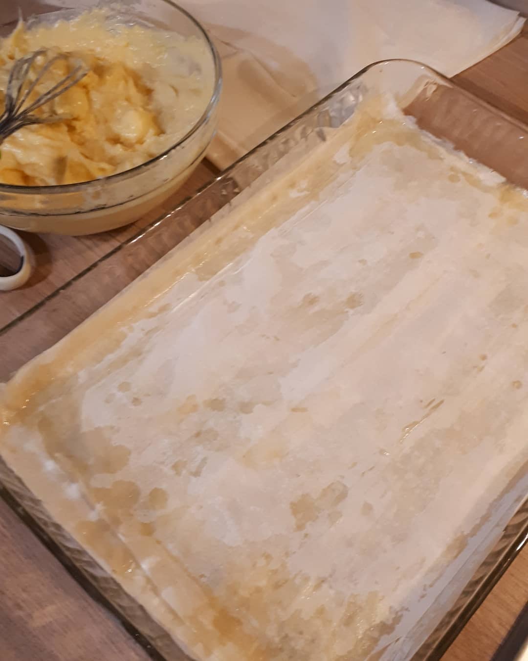 تم ناخد ورق الفيلو نسرح الورق 2 حتى 3 ورقات تم ندهن بالزبدة ونضيف ورقات اخرى حتى نضع نصف الورق، تم نصب الكريمة ونغطي ببقية الورق كيف ما عملنا بالاول، نقطع كيف ما موضح في الصورة وتدخل الفرن على درجة حرارة 180 وبالصحة والراحة