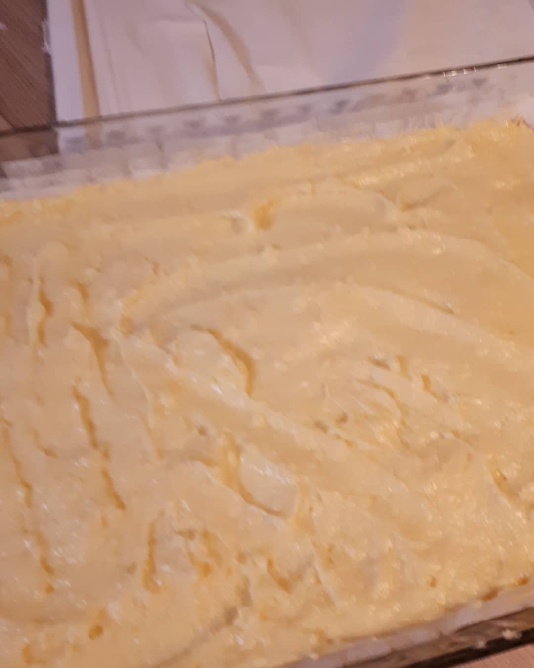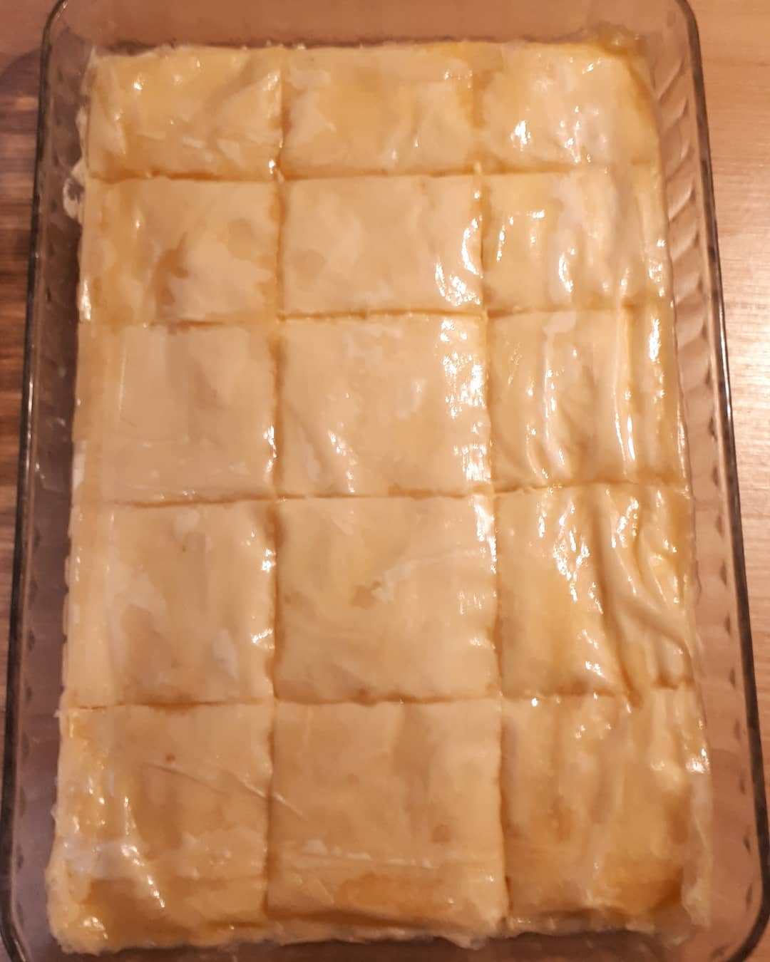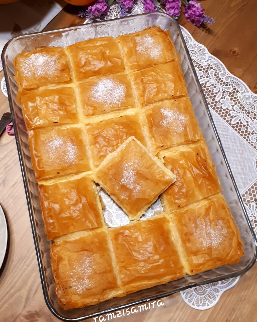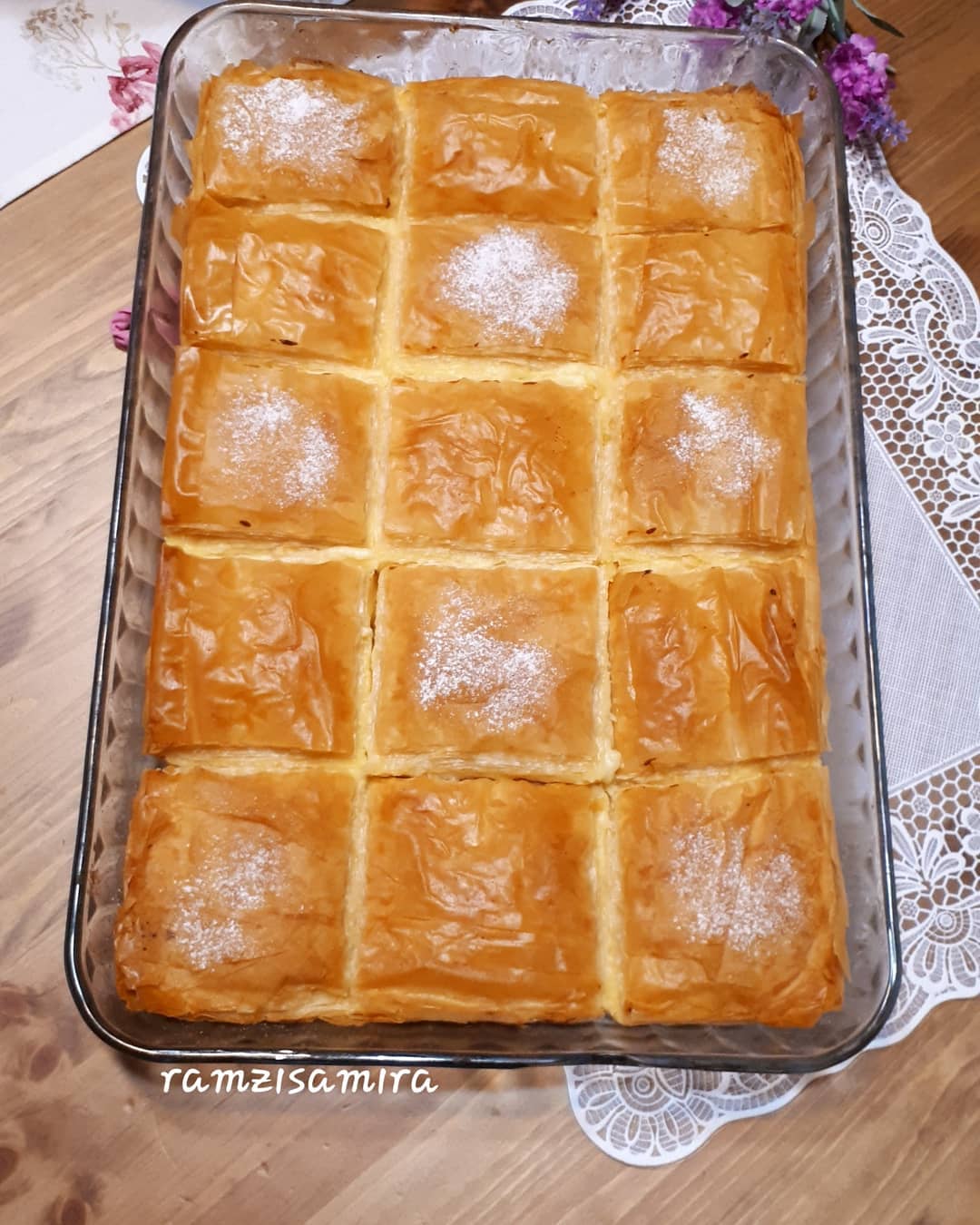 تم ناخد ورق الفيلو نسرح الورق 2 حتى 3 ورقات تم ندهن بالزبدة ونضيف ورقات اخرى حتى نضع نصف الورق، تم نصب الكريمة ونغطي ببقية الورق كيف ما عملنا بالاول، نقطع كيف ما موضح في الصورة وتدخل الفرن على درجة حرارة 180 وبالصحة والراحة