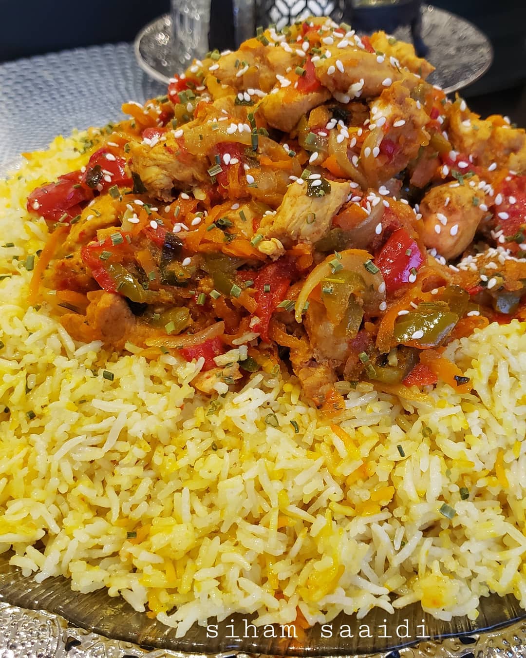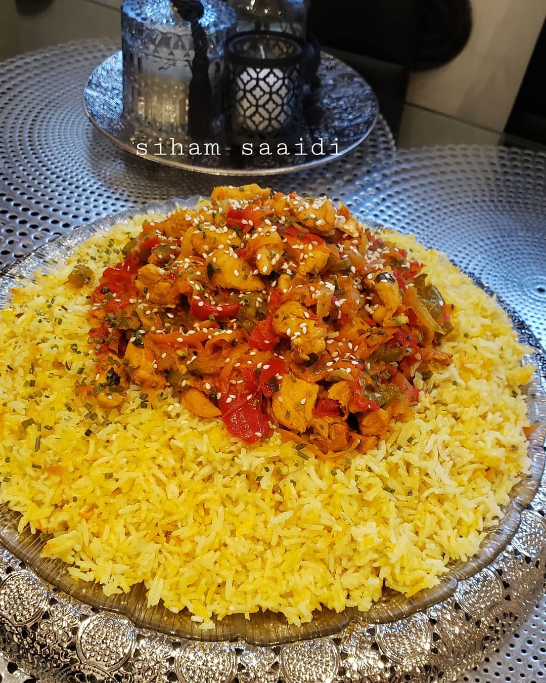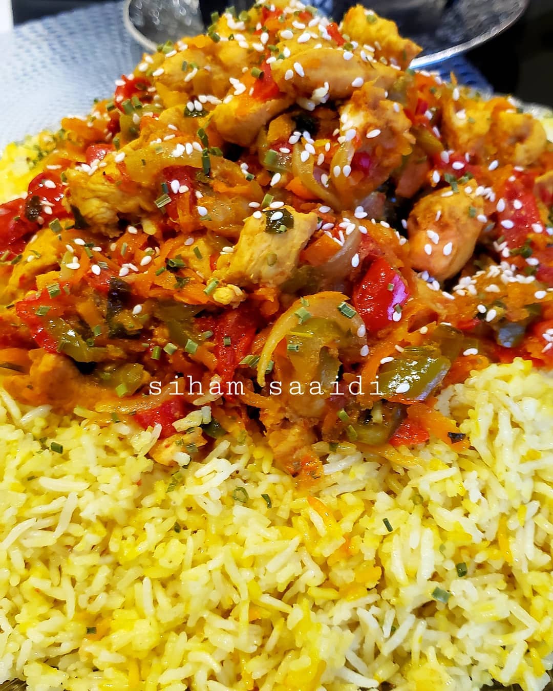 نضع الروز في طبق التقديم و فوقه صلصةدجاج وزينت بقليل من زنجلال بالصحة والراحة