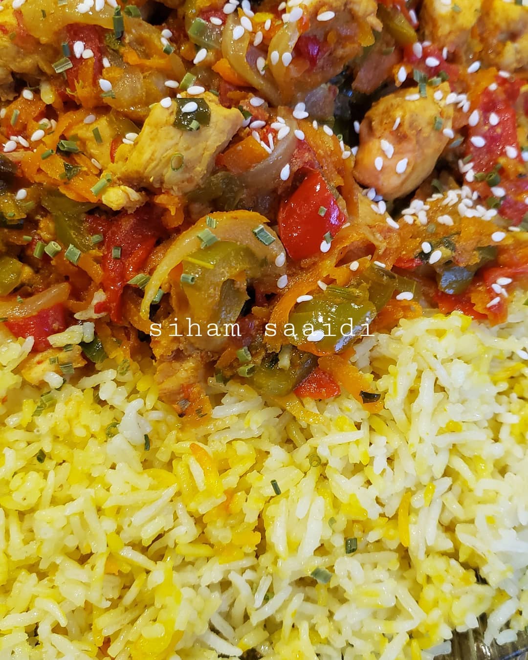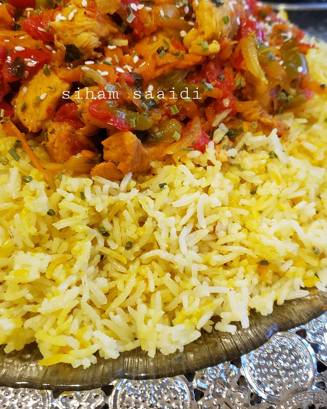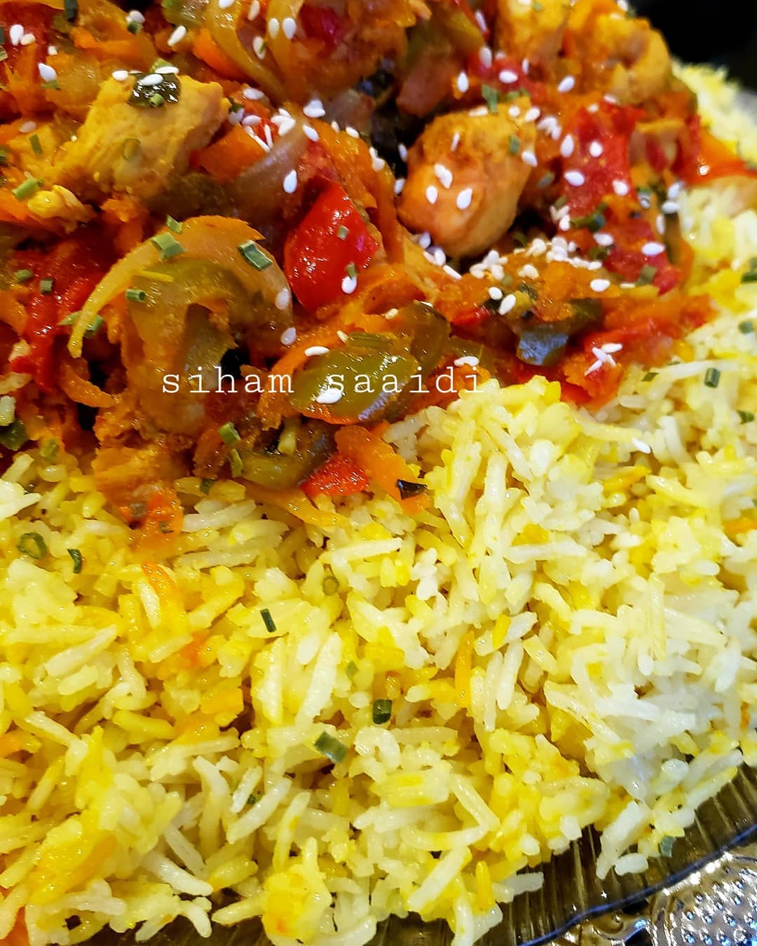 نضع الروز في طبق التقديم و فوقه صلصةدجاج وزينت بقليل من زنجلال بالصحة والراحة