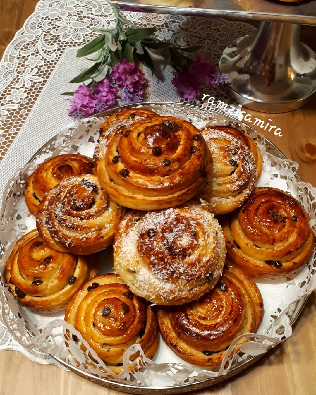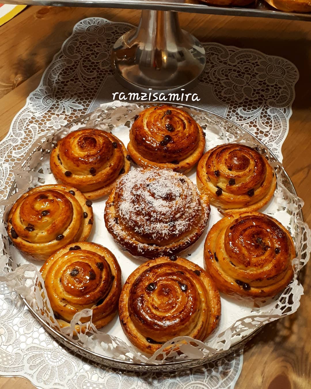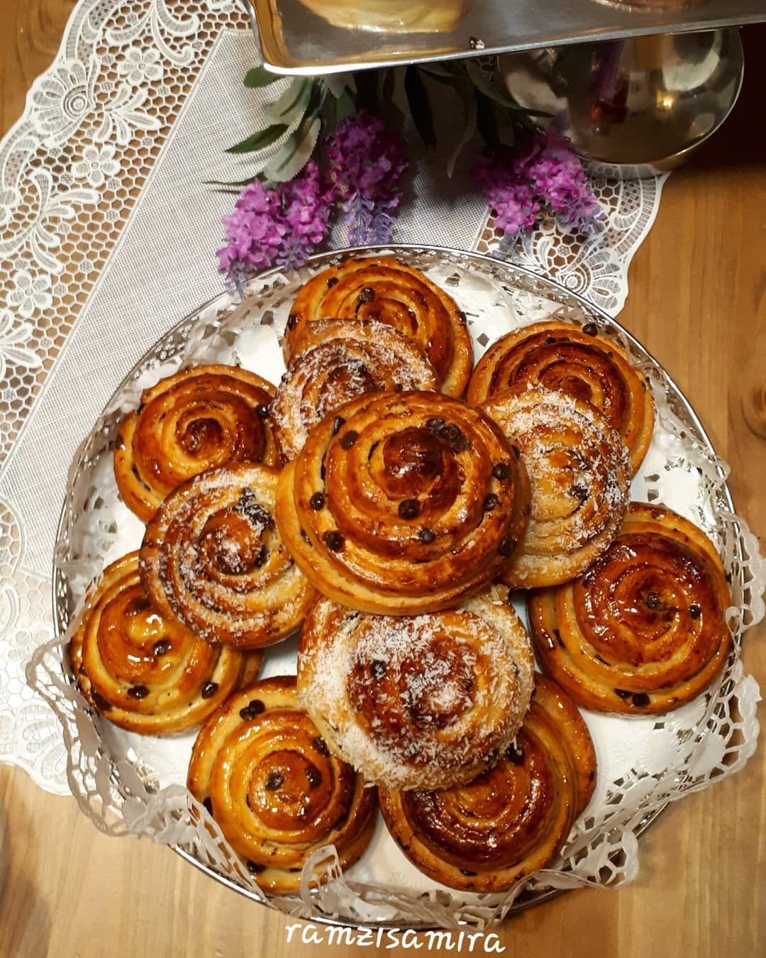 بعد الاختمار تقسم العجينة الى أتنين تسرح بالمدلك كيف ما موضح في الصورة تدهن بملعقة كبيرة زبدة ترش بالسكر وحبيبات الشكلاط تلف وتترك حتى تختمر مرة اخرى