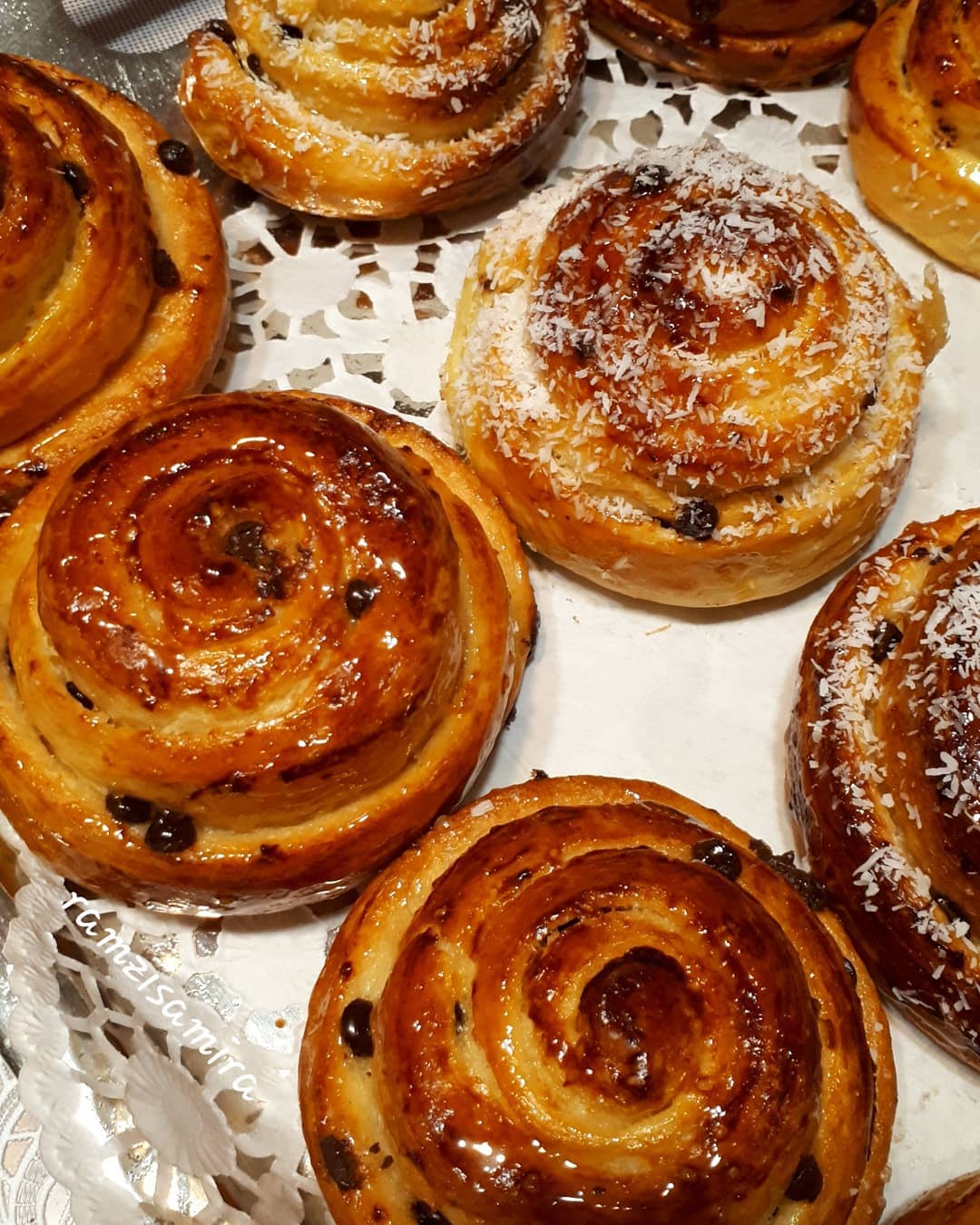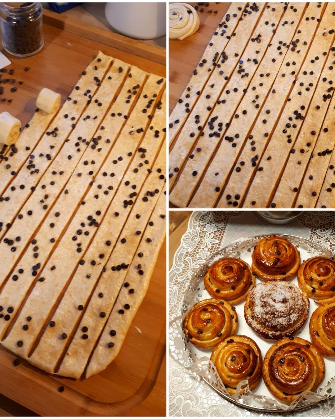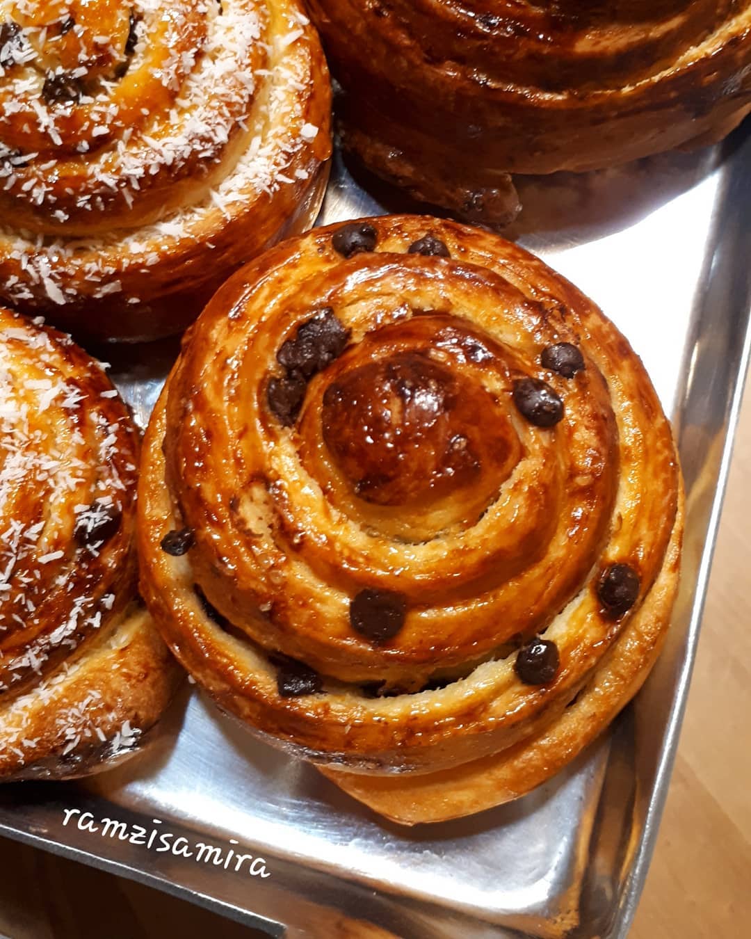 بعد الاختمار تقسم العجينة الى أتنين تسرح بالمدلك كيف ما موضح في الصورة تدهن بملعقة كبيرة زبدة ترش بالسكر وحبيبات الشكلاط تلف وتترك حتى تختمر مرة اخرى