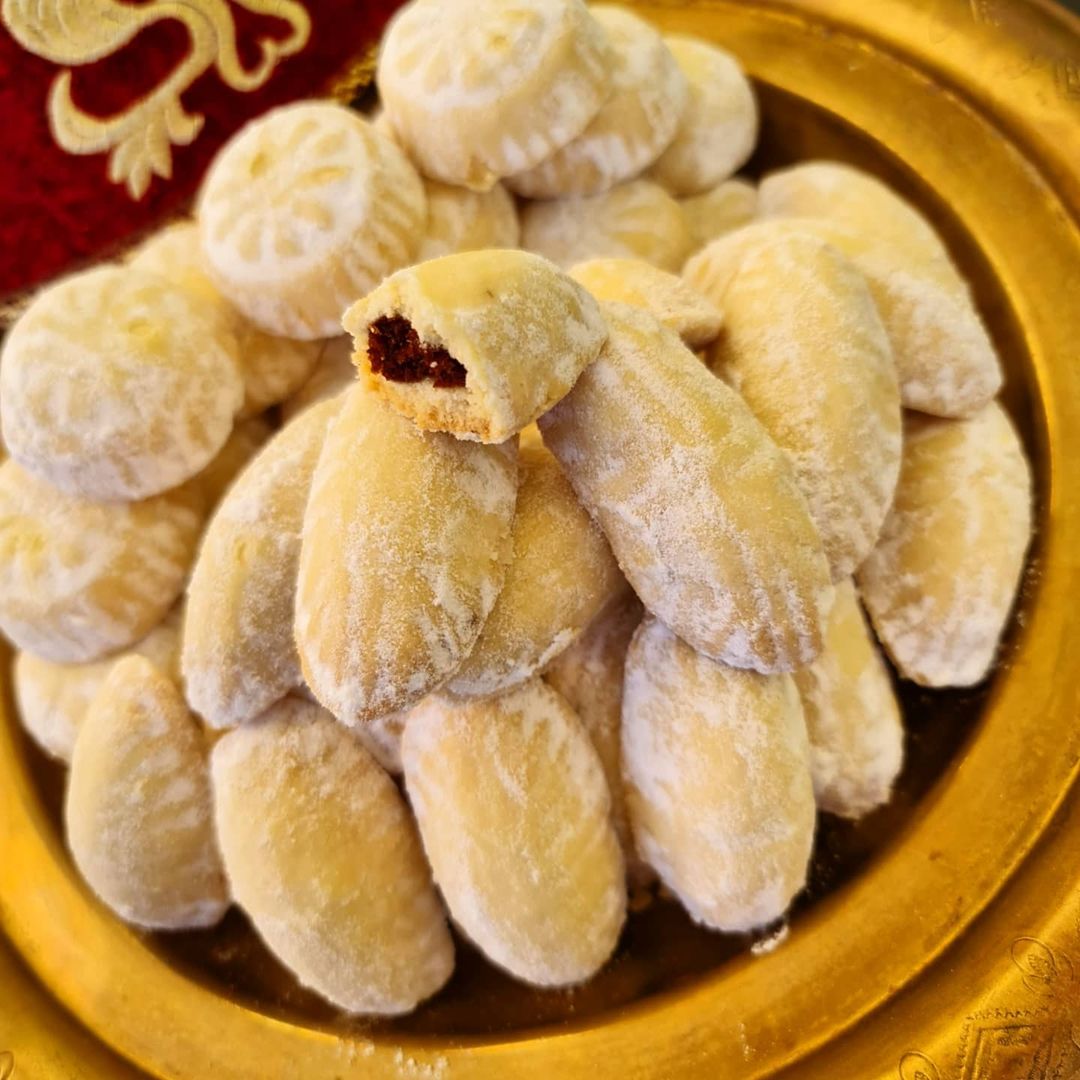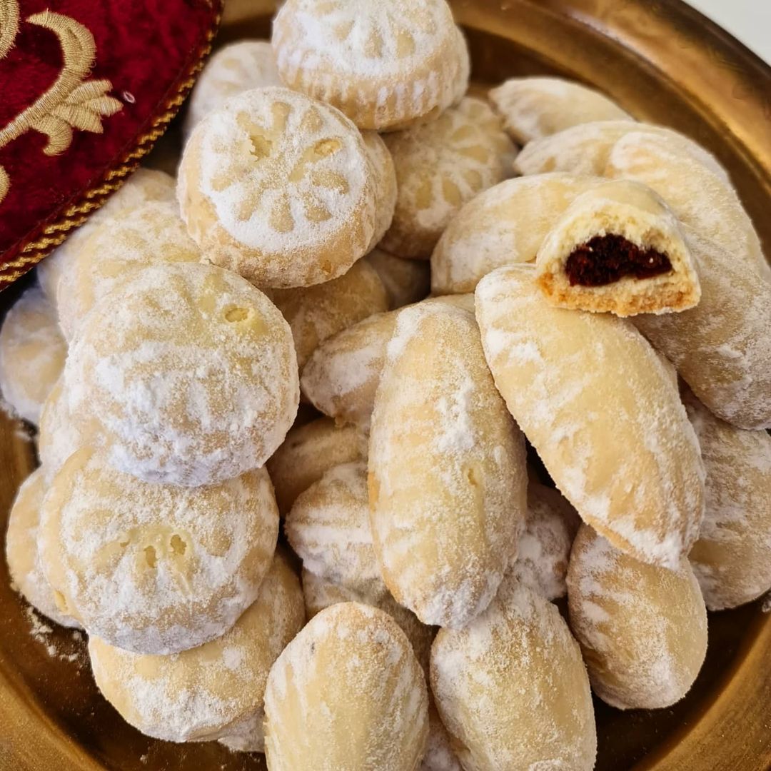 بعد إخراج معمول تمر من الفرن نمرره في السكر الناعم