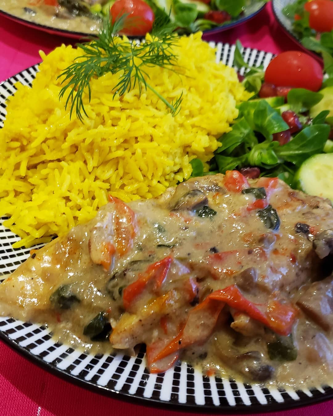 نزيل صدور الدجاج و في نفس مقلاة نقي بصلة مقطعة رقيقة مع التوم مطحون تم نضيف شرائح الفطر و حبة فلفل احمر حلو مقطع قطع رقيقة ثم نضيف ملعقة كبيرة نشا ملح ابزار ملعقة خردل اي موطارد نقلي الكل قليلا تم نضع كريمة الطبخ وقليل من ماء نتركها تغلي