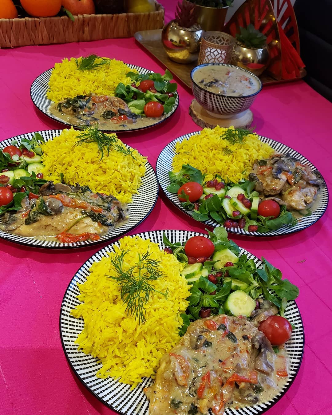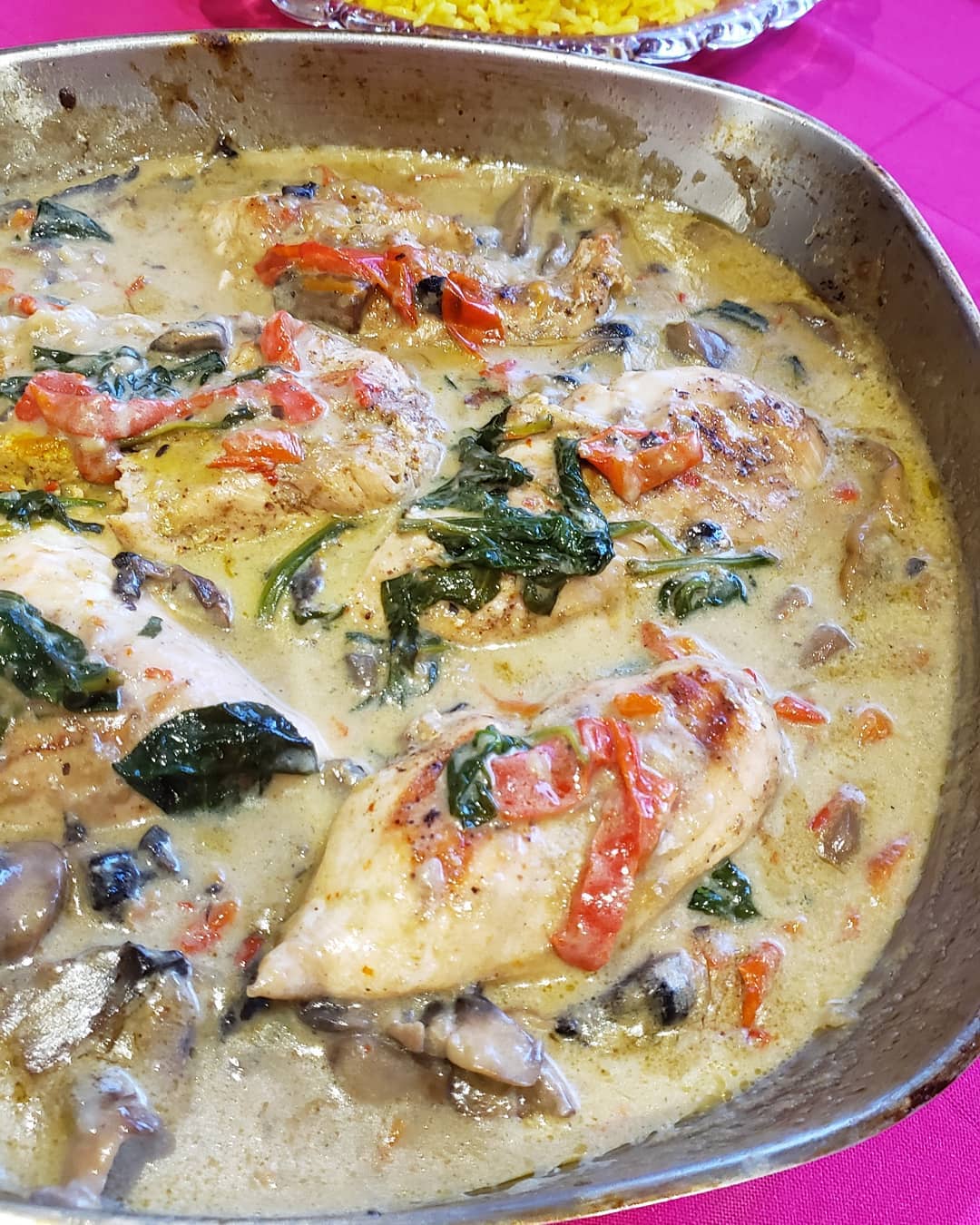 تم نضيف سبانخ طرية تم صدور الدجاج المطهوة سابقا