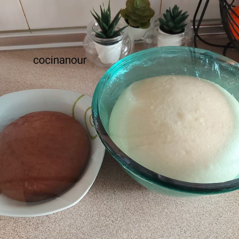 نأخد ربع العجين ونضيف ليه معلقة كبيرة عامرة كاكاو ونعجنها جيدا