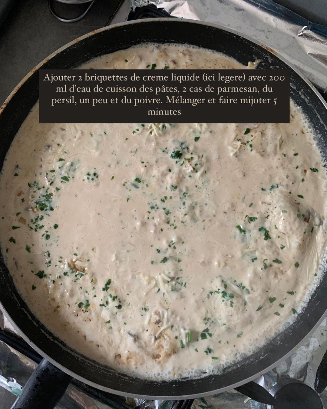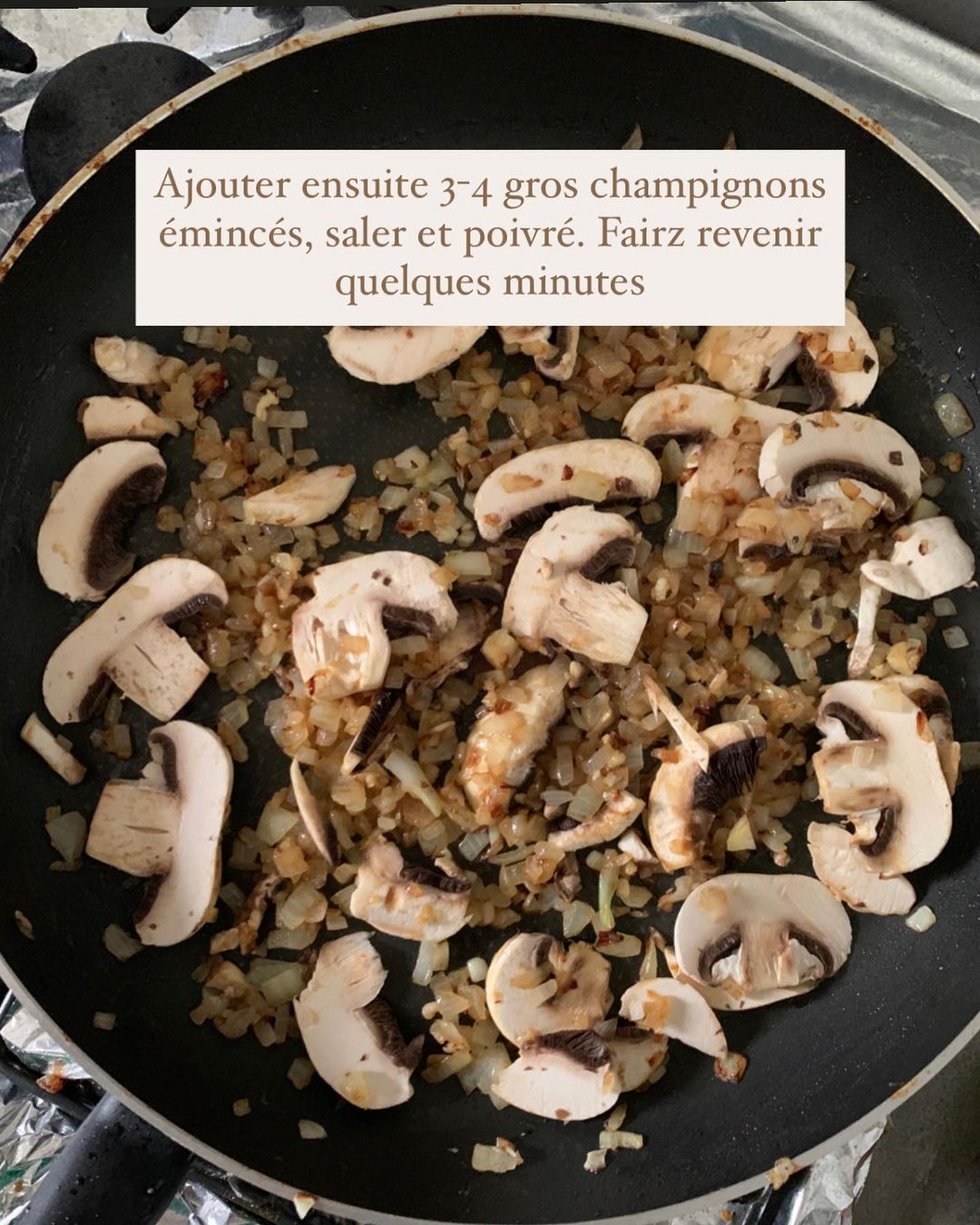بعد أن يتحمر البصل نضيف قطع من الفطر ثم نضيف الكريم الفريش و القليل من الماء الساخن و القليل من الجبن