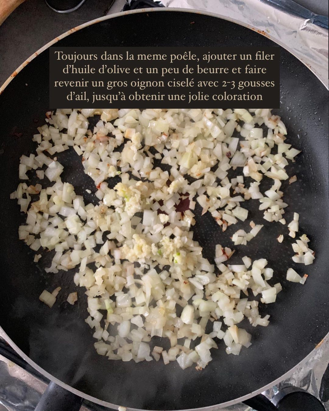 نزيل صدور الدجاج و في نفس المقلاة نضع القليل من زيت الزيتون و قطعة من الزبدة و بصلة مقطعة رقيقة جدا نضيف فصين او ثلاث من الثوم ملح ابزار