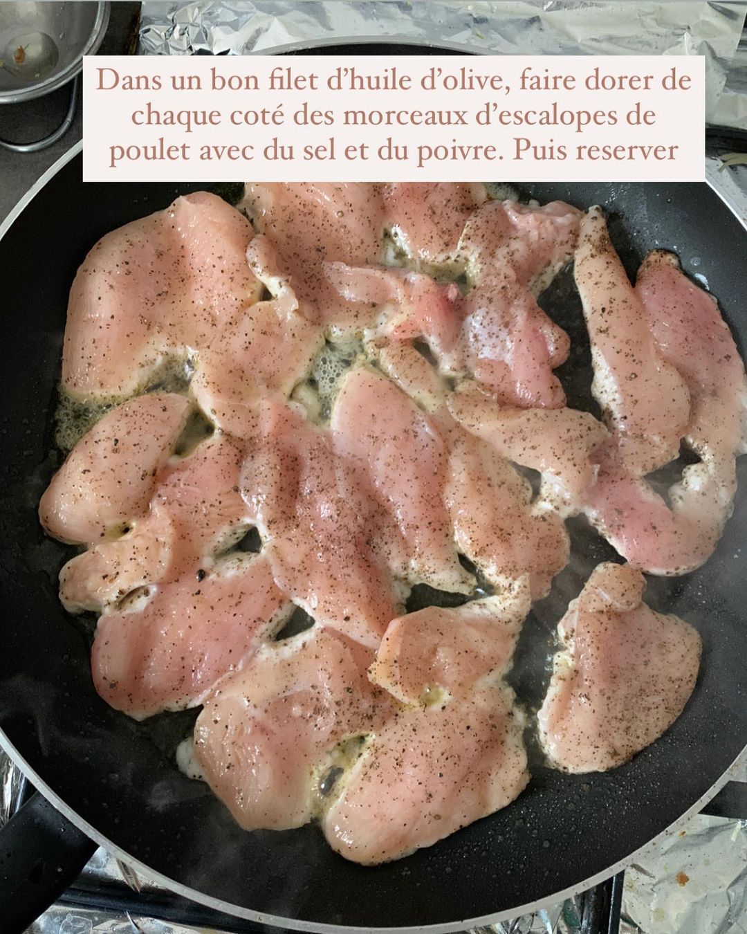 في مقلاة على النار بها زيت الزيتون نحمر صدور الدجاج المثبلة بالملح و الفلفل الاسور من الجهتين حتى يأخذوا لونا ذهبيا
