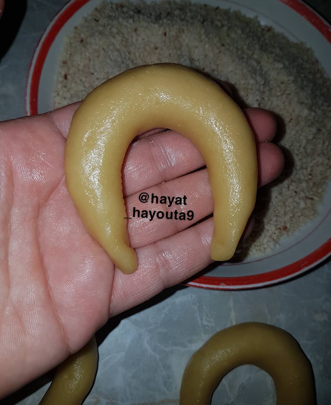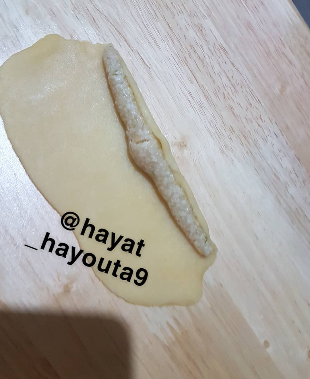 و من ترتاح العجينة ابسطي الكورة فوق طويلة العمل و حليها على العرض و الطول بالحلال و حطي الحشو في الوسط و شكليه كيما راني حطتلكم في التصاوير