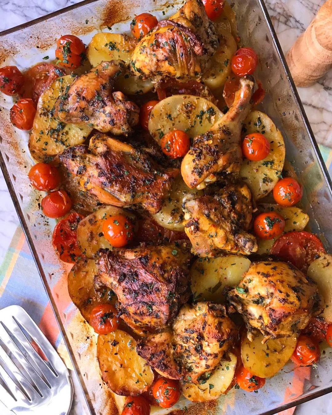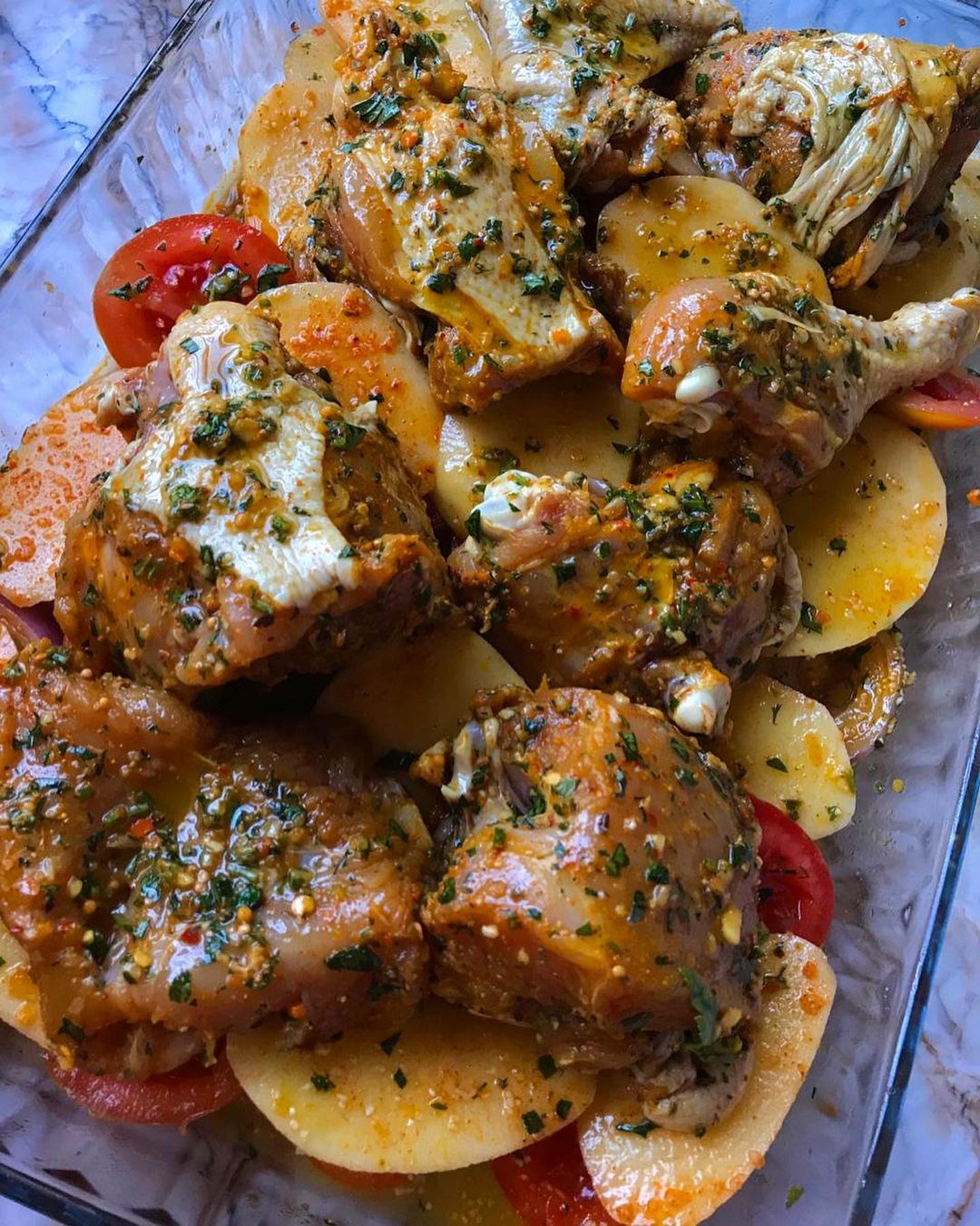 نأخد إناء فرن نقطع فيه البصل بطاطس وطماطم ونتبلها بنفس تثبيلة الدجاج ممكن اضافة اي خضر تعجبكم ثم نضيف فوقهم الدجاج ثم نغطيه بورق الطبخ ثم الألومنيوم والى الفرن