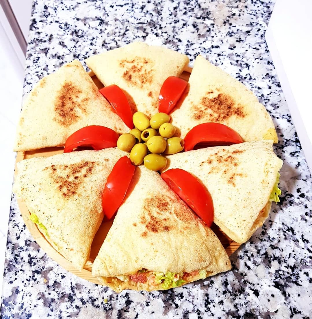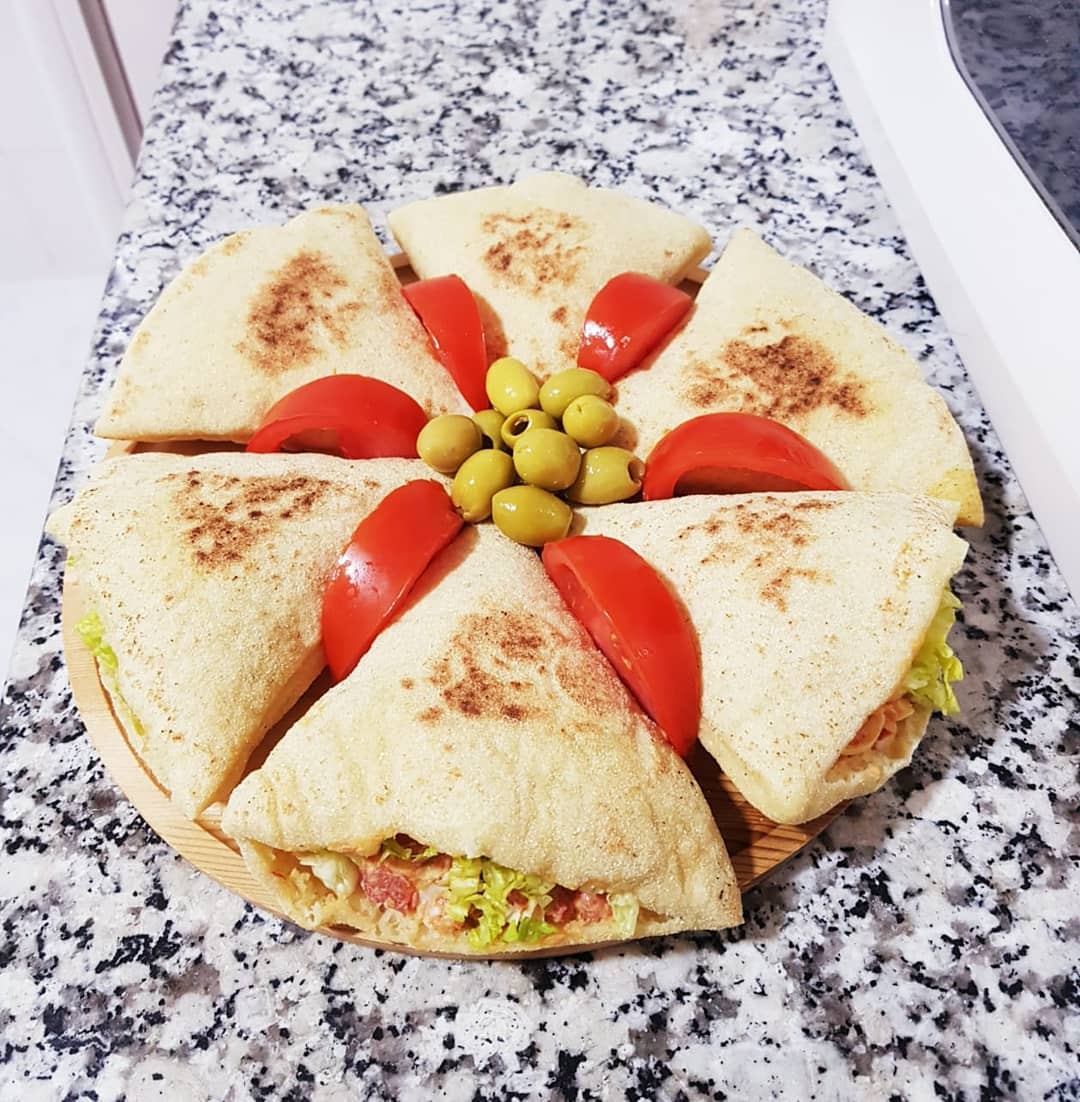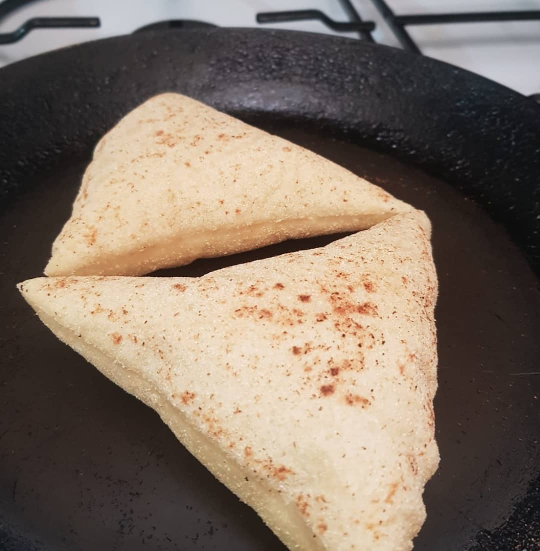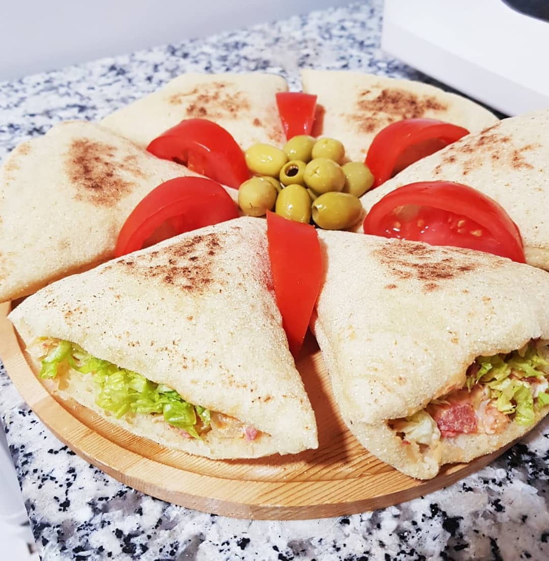 3كؤوس دقيق ابيض، كأس ونصف دقيق القمح الكامل، ملعقة صغيرة ملح، ملعقة كبيرة خميرة الخبز،نعجنو بماء دافئ ونتركه يختمر حتى يتضاعف حجمه ،نشكلو منو 3كرات نطلقوهوم رقاق بمساعدة دقيق القمح الكامل ونقطعو مثلثات بقطاعة البيتزا ،نتركوهوم يختمرو نصف ساعة ثم نطيبوهوم فمقلاة ناشفة على نار عالية ،كي نحطوهوم فالمقلاة نقلبوهوم قبل مايتشكلو الفقاعات حتى يتحمرو وينتافخو