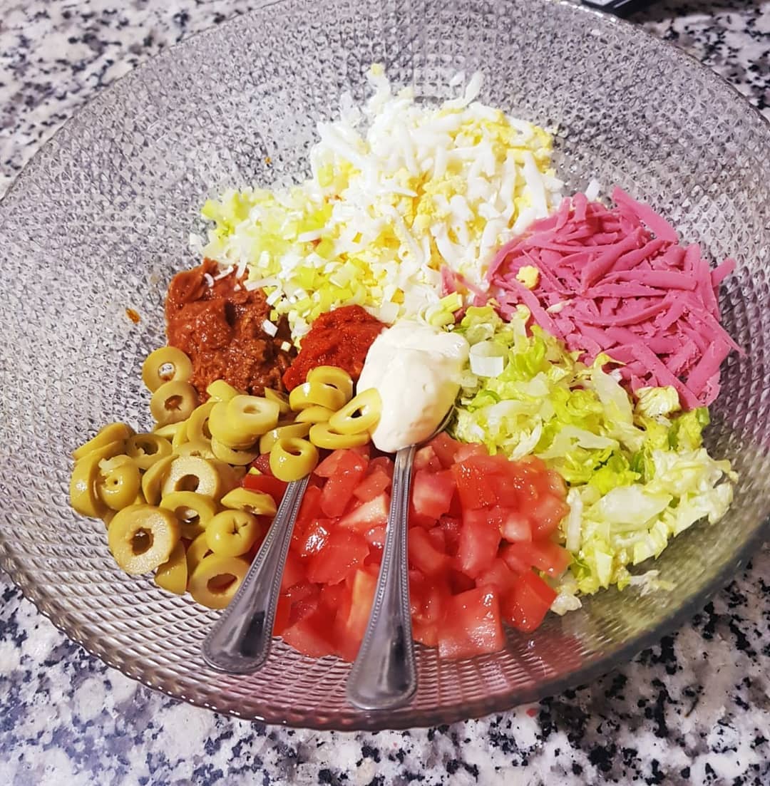 حشوة البطبوط : طون بصلصة الطماطم ،بيض مسلوق محكوك، كاشير محكوك، بصل اخضر مفروم، خس مقطع رقيق،طماطم مقطعة مكعبات صغيرة، زيتون دوائر،ملعقة كبيرة مايونيز،ملعقة صغيرة هريسة،ملعقة صغيرة خل،رشة فلفل اسود ونخلطو كلشي ونحشيو البطبوط