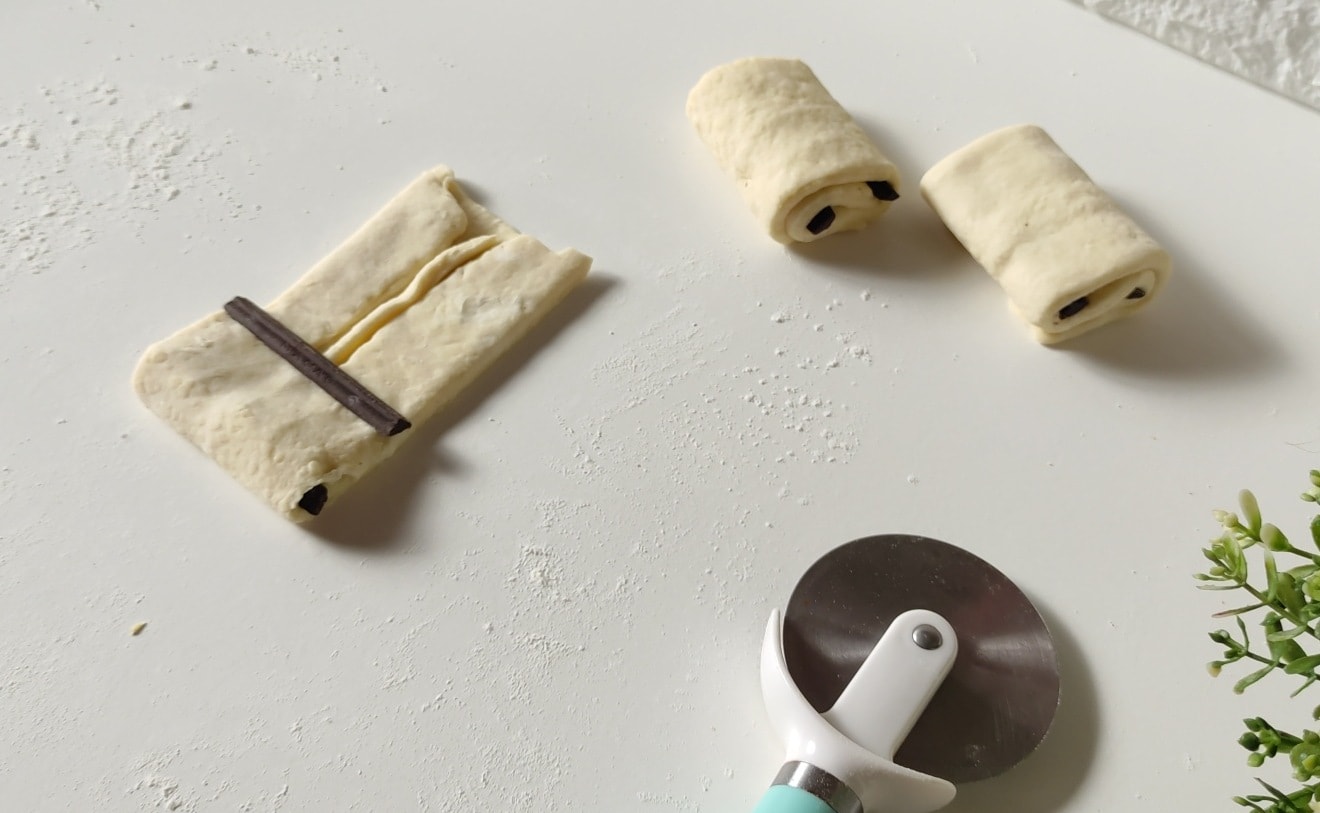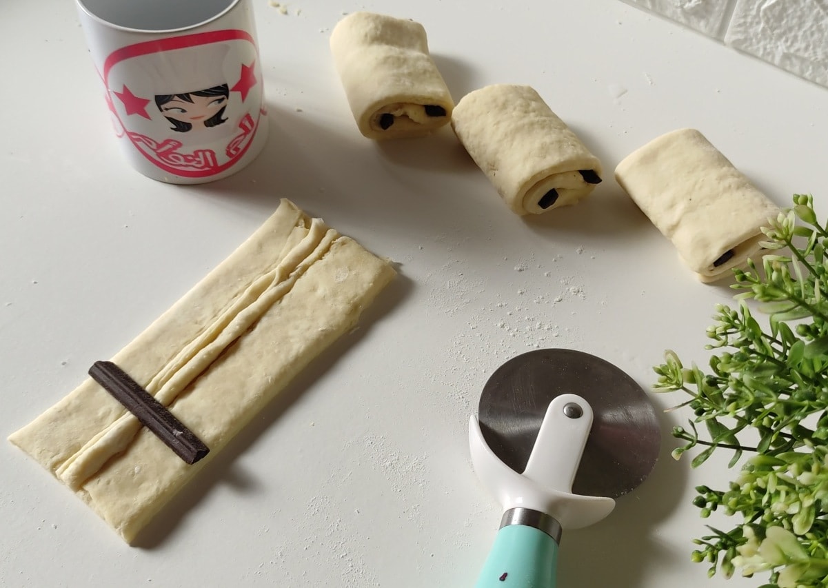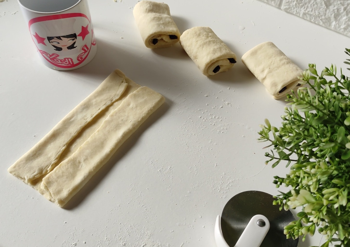 من بعد ما نكملو الكمية ناخدو اول وحدة و نبسطها بدلاك متكونش رقيقة الى بغينا الطرواصة تجينا رقيقة كنقسموها على زوج اي كل وحدة نخرجو منها زوج كرواصات كيف الصورة راه كاينة بحجم كبير و حجم صغير