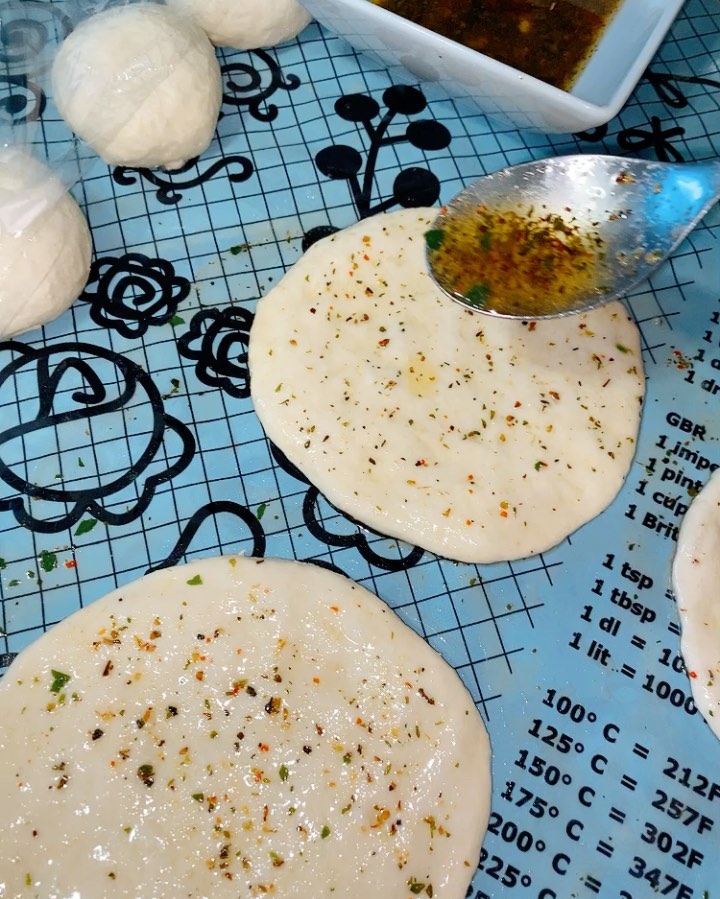 فوق سطح العمل نقسم العجين لكرات متساوية ونطلقهم بالاستعانة بالزيت والزبدة المذابة ثم ندهن كل واحدة بالخلطة من الجهتين