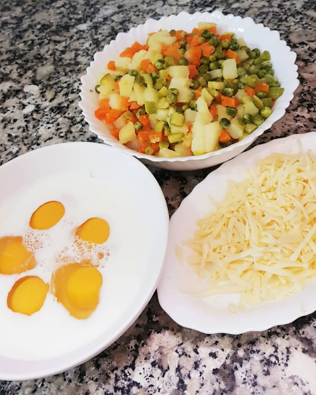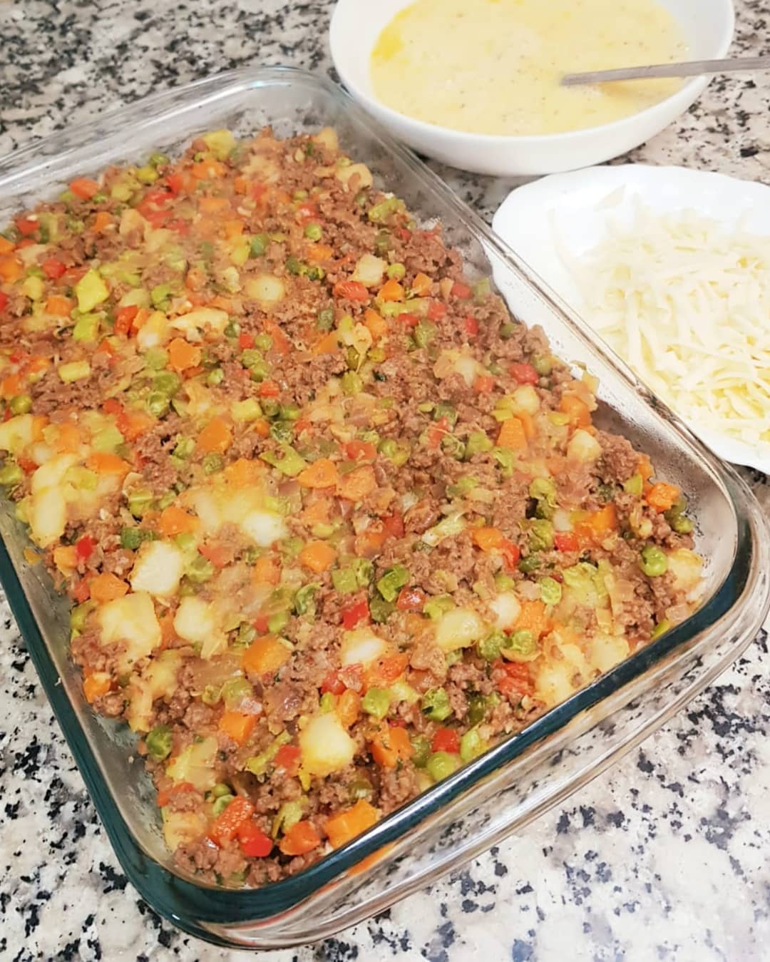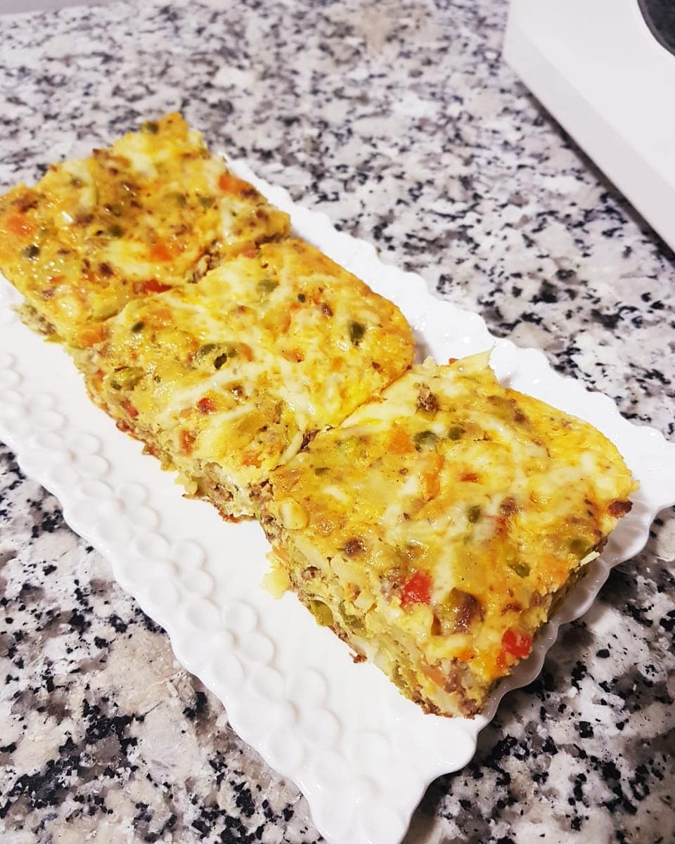 نخلطو الخضر المسلوقة مع خليط الكفتة ونوضعوه فمول ونصبو فوقو خليط البيض(5بيضات ،نصف كاس حليب، ملعقة كبيرة جبن كريمي، رشة ملح وفلفل أسود ) ونرشو الجبن محكوك وندخلوه للفرن
