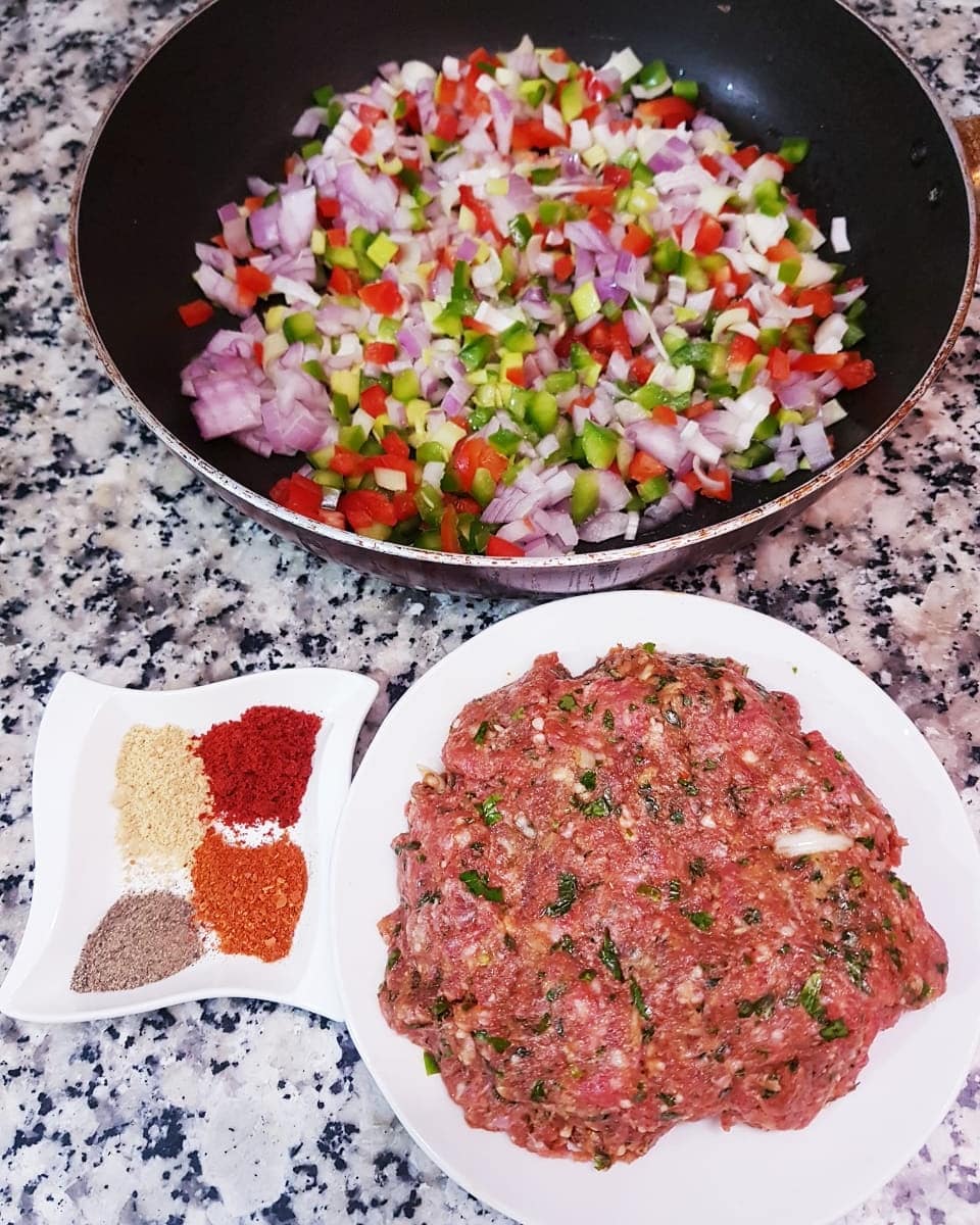 في مقلاة نشوحو فنصف كأس زيت كل من فلفل الوان وبصل وكراث مفروم ونضيفو الكفتة متبلة (كنخلطو معاها بصل وتوم الملح و الفلفل الاسود والزنجبيل وبقدونس كمون فلفل حار وشوية زيت )