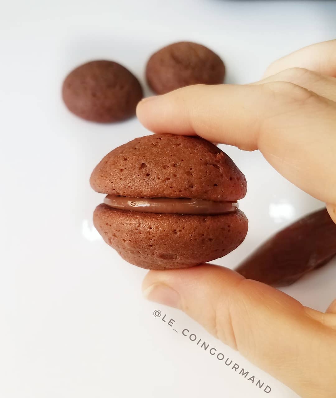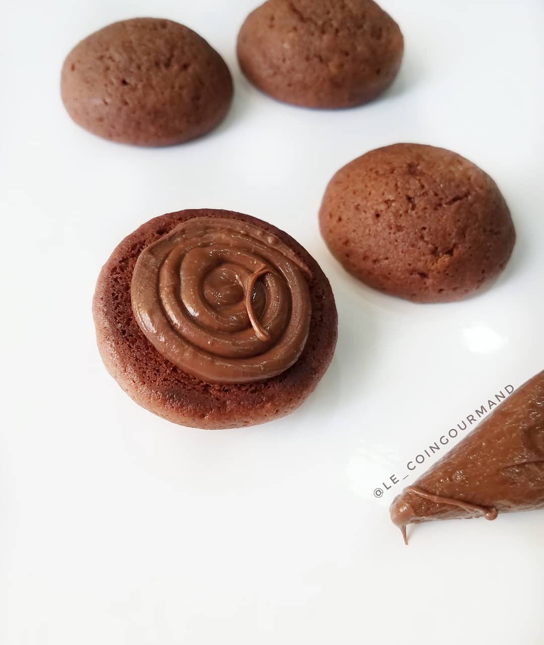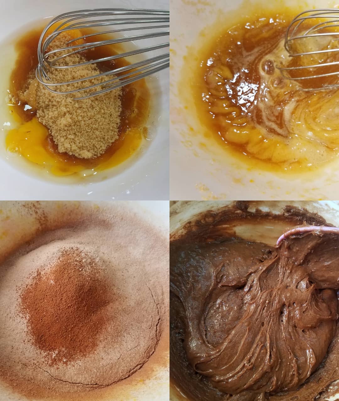 بعدها اضيف 90 غ زبدة دائبة ونواصل الخفق.ثم نضيف 150غ فرينة، 20غ مايزينة ، 30غ كاكاو ، نصف كيس خميرة الحلوى