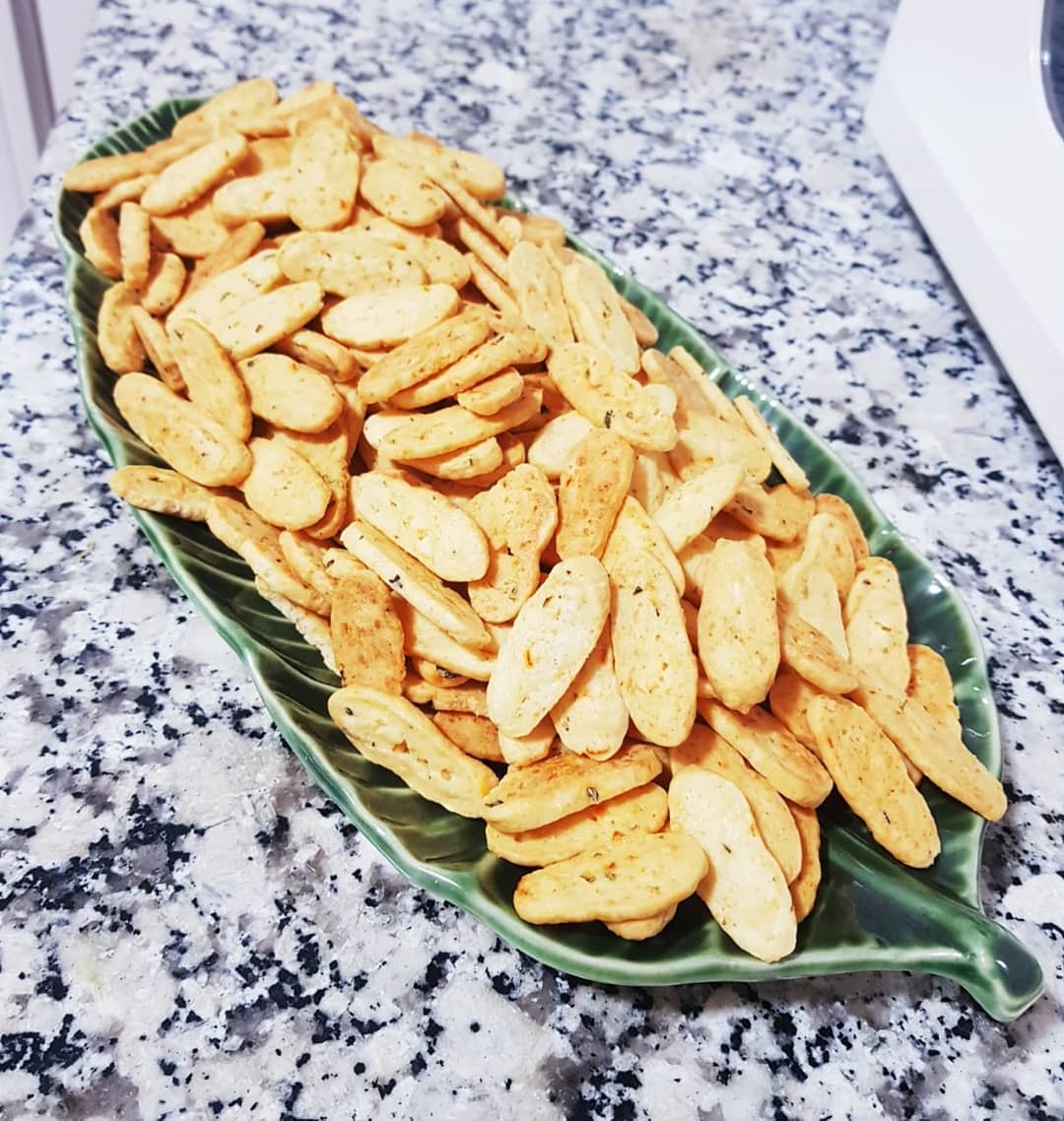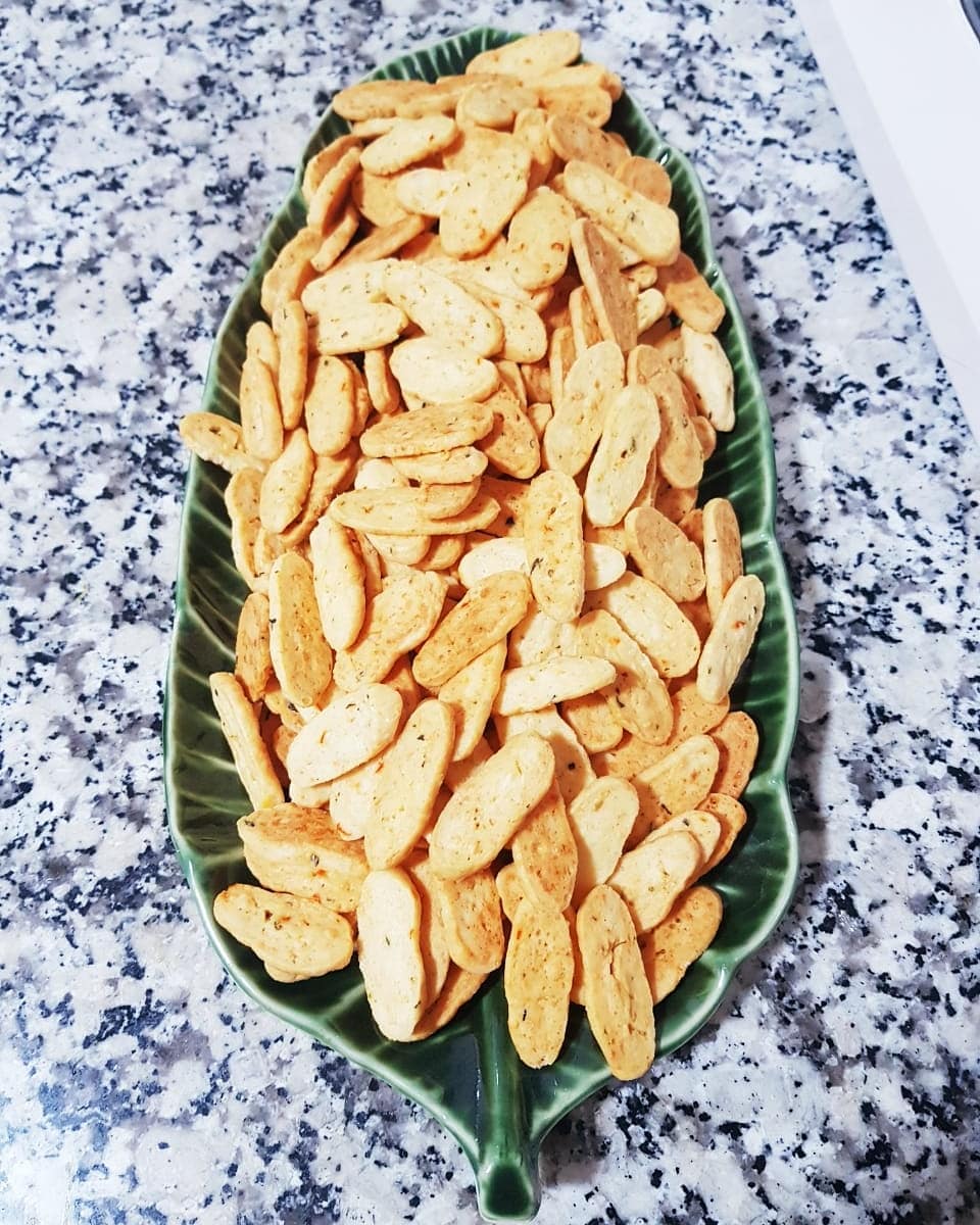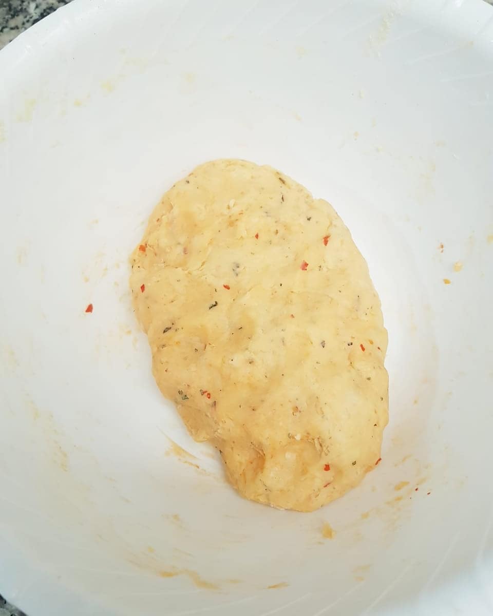 300غ دقيق ابيض نبسسوه ب150 غ زبدة و2 ملاعق كبار زيت، نضيفو رشة ملح وفلفل أسود وزعتر محكوك، نضيفو جبن أحمر (إيدام) محكوك رقيق وملعقة صغيرة هريسة حارة وملعقة صغير خميرة حلويات