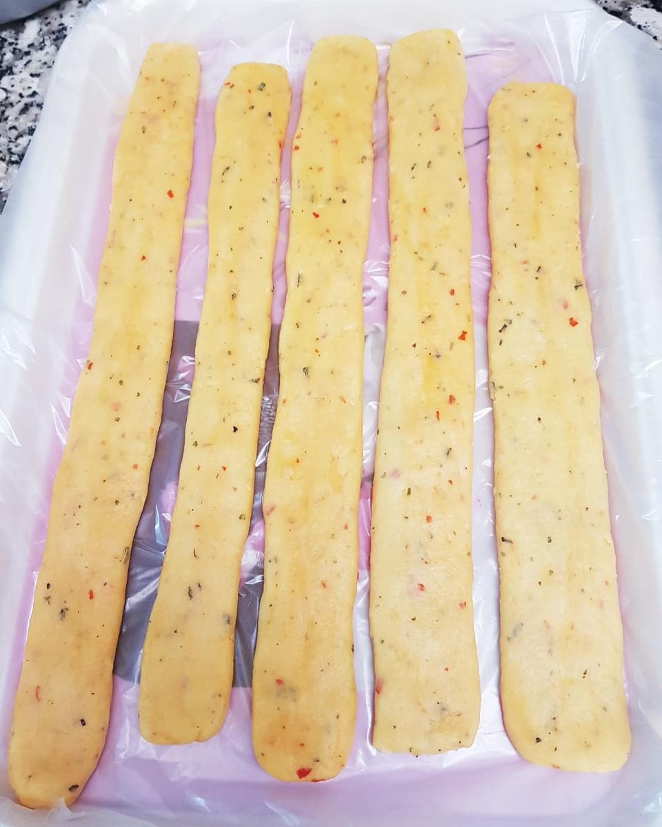 ونشكلو من العجين بودان نبسطوه براحة اليد حتى يصبح مستطيل وندخلوهوم للمجمد ونقطعوه بشكل طولي رقيق نوضعوه فصينية وندخلوه للفرن على 180درجة