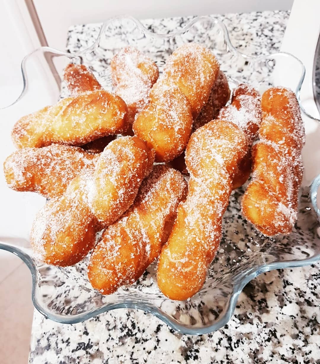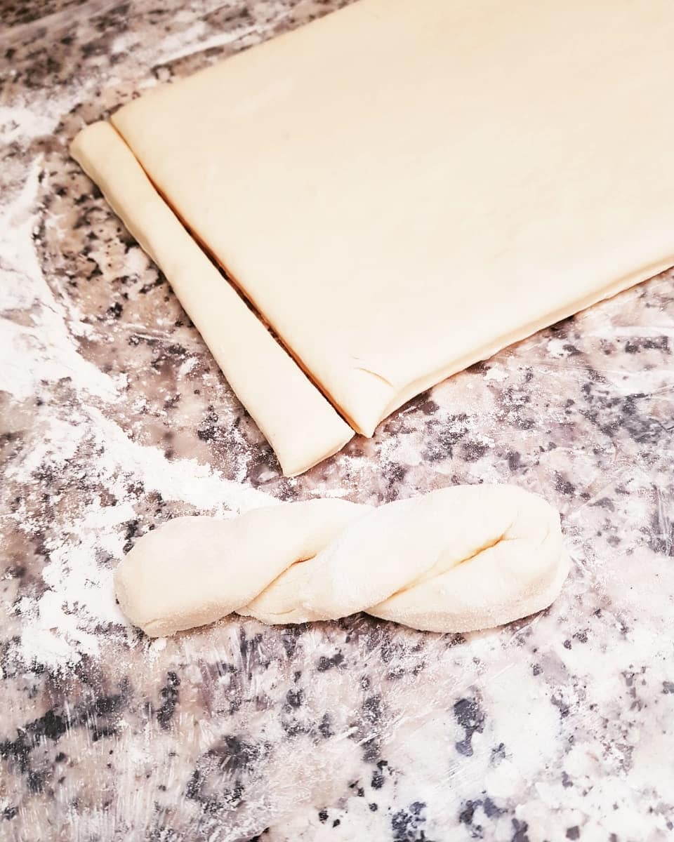 نخليوه يختمر ساعة ثم نطلقوه سميك ونقطعوه شرائط، نطولو الشريط بيدينا ونطويو على 2 ونلفوه