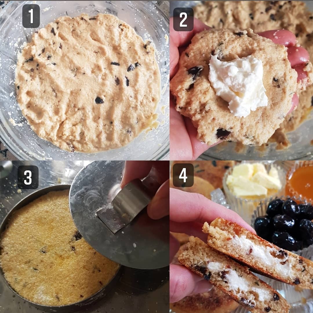في إناء كناخد السميدة ونضيف ليها الملح والسكر ثم الزيت مخلط مع الزبدة ونخلط الكل بأطراف الاصابع بدون عجن ثم نضيف خميرة الحلويات،ورأس معلقة خميرة الخبز،الزعتر، زيتون مقطع نخلط الكل ثم نضيف الحليب ونجمع دائما بدون عجن ثم نحشو كل واحدة بالجبن استعملت جبلي وتطهى في مقلاة من الجهتين